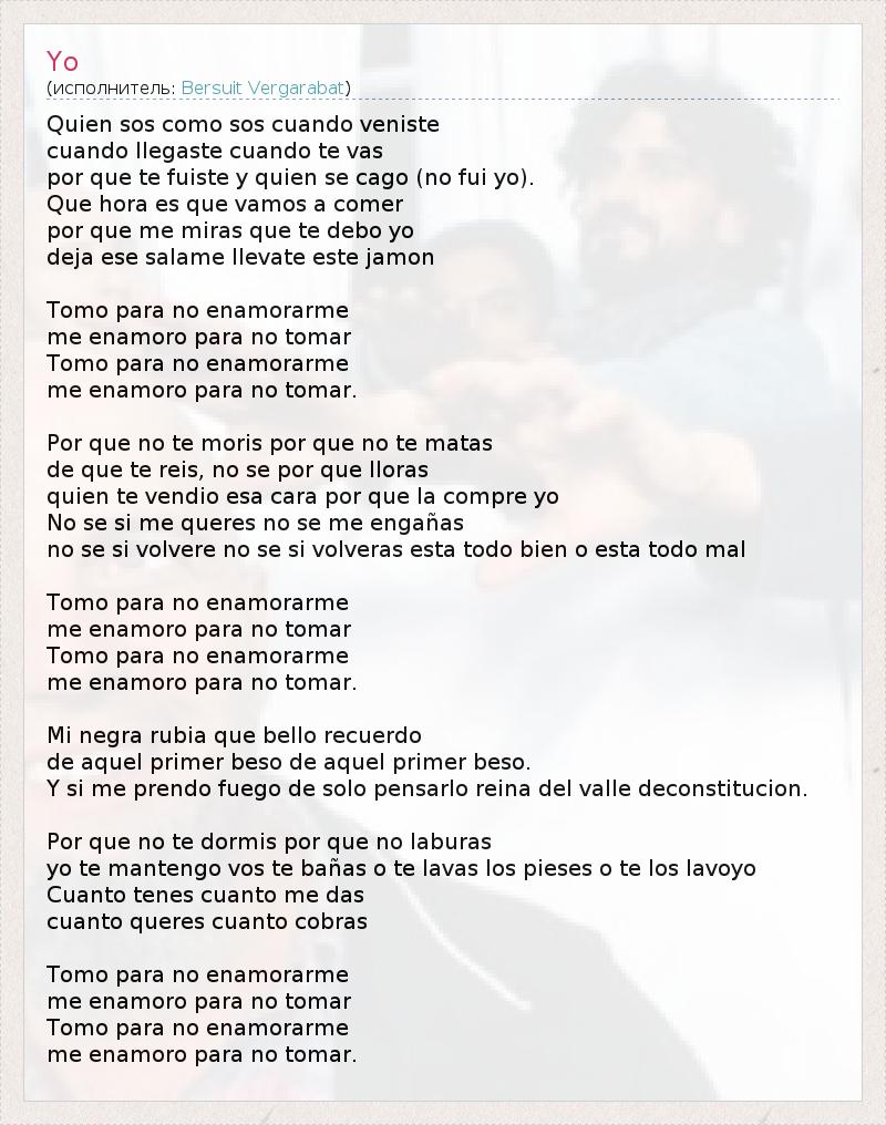 Это интересно:Bersuit Vergarabat, сформировались в 1989 в Аргентине и являются одними из наиболее известных исполнителей латинского рока 90-х.После 2 х андеграундовых альбомов, группа стала смешивать рок с латиноамериканскими ритмами такими как кумбиа(колумбийский народный танец), чакарера(испанский танец), кандомбе(негритянский танец под барабаны) и куртетанзо(тоже латинский... продолжение