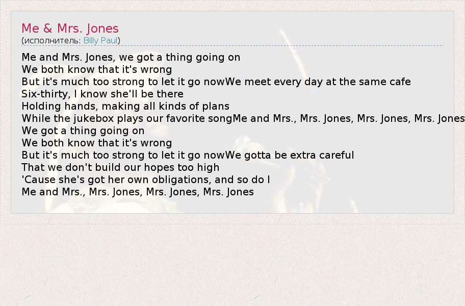 Me and Mrs. Jones, we got a thing going on We both know that it's wrong But it's much too strong to let it go nowWe meet every day at the same cafe Six-thirty, I know she'll be there Holding hands, making all kinds of plans While the jukebox plays our favorite songMe and Mrs., Mrs. Jones, Mrs. Jones, Mrs. Jones We got a thing going on We both know that it's wrong But it's much too strong to let it go nowWe gotta be extra careful That we don't build our hopes too high 'Cause she's got her own obligations, and so do I Me and Mrs., Mrs. Jones, Mrs. Jones, Mrs. Jones