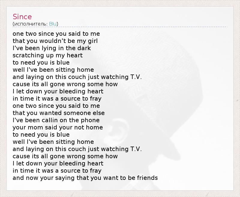 one two since you said to me that you wouldn't be my girl I've been lying in the dark scratching up my heart to need you is blue well I've been sitting home and laying on this couch just watching T.V. cause its all gone wrong some how I let down your bleeding heart in time it was a source to fray one two since you said to me that you wanted someone else I've been callin on the phone your mom said your not home to need you is blue well I've been sitting home and laying on this couch just watching T.V. cause its all gone wrong some how I let down your bleeding heart in time it was a source to fray and now your saying that you want to be friends