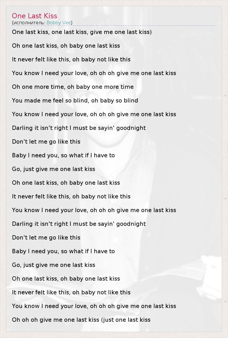 One last kiss, one last kiss, give me one last kiss) Oh one last kiss, oh baby one last kiss It never felt like this, oh baby not like this You know I need your love, oh oh oh give me one last kiss Oh one more time, oh baby one more time You made me feel so blind, oh baby so blind You know I need your love, oh oh oh give me one last kiss Darling it isn't right I must be sayin' goodnight Don't let me go like this Baby I need you, so what if I have to Go, just give me one last kiss Oh one last kiss, oh baby one last kiss It never felt like this, oh baby not like this You know I need your love, oh oh oh give me one last kiss Darling it isn't right I must be sayin' goodnight Don't let me go like this Baby I need you, so what if I have to Go, just give me one last kiss Oh one last kiss, oh baby one last kiss It never felt like this, oh baby not like this You know I need your love, oh oh oh give me one last kiss Oh oh oh give me one last kiss (just one last kiss