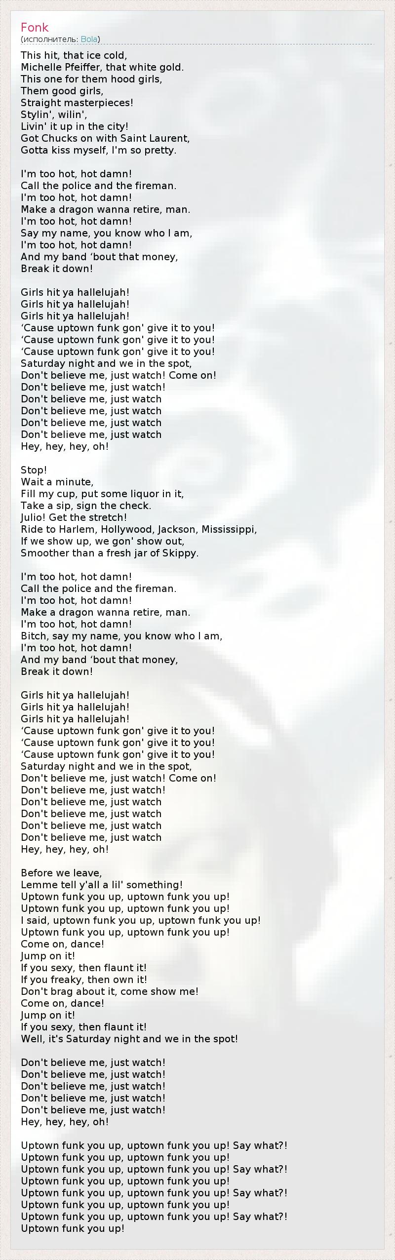 This hit, that ice cold, Michelle Pfeiffer, that white gold. This one for them hood girls, Them good girls, Straight masterpieces! Stylin', wilin', Livin' it up in the city! Got Chucks on with Saint Laurent, Gotta kiss myself, I'm so pretty. I'm too hot, hot damn! Call the police and the fireman. I'm too hot, hot damn! Make a dragon wanna retire, man. I'm too hot, hot damn! Say my name, you know who I am, I'm too hot, hot damn! And my band ‘bout that money, Break it down! Girls hit ya hallelujah! Girls hit ya hallelujah! Girls hit ya hallelujah! ‘Cause uptown funk gon' give it to you! ‘Cause uptown funk gon' give it to you! ‘Cause uptown funk gon' give it to you! Saturday night and we in the spot, Don't believe me, just watch! Come on! Don't believe me, just watch! Don't believe me, just watch Don't believe me, just watch Don't believe me, just watch Don't believe me, just watch Hey, hey, hey, oh! Stop! Wait a minute, Fill my cup, put some liquor in it, Take a sip, sign the check. Julio! Get the stretch! Ride to Harlem, Hollywood, Jackson, Mississippi, If we show up, we gon' show out, Smoother than a fresh jar of Skippy. I'm too hot, hot damn! Call the police and the fireman. I'm too hot, hot damn! Make a dragon wanna retire, man. I'm too hot, hot damn! Bitch, say my name, you know who I am, I'm too hot, hot damn! And my band ‘bout that money, Break it down! Girls hit ya hallelujah! Girls hit ya hallelujah! Girls hit ya hallelujah! ‘Cause uptown funk gon' give it to you! ‘Cause uptown funk gon' give it to you! ‘Cause uptown funk gon' give it to you! Saturday night and we in the spot, Don't believe me, just watch! Come on! Don't believe me, just watch! Don't believe me, just watch Don't believe me, just watch Don't believe me, just watch Don't believe me, just watch Hey, hey, hey, oh! Before we leave, Lemme tell y'all a lil' something! Uptown funk you up, uptown funk you up! Uptown funk you up, uptown funk you up! I said, uptown funk you up, uptown funk you up! Uptown funk you up, uptown funk you up! Come on, dance! Jump on it! If you sexy, then flaunt it! If you freaky, then own it! Don't brag about it, come show me! Come on, dance! Jump on it! If you sexy, then flaunt it! Well, it's Saturday night and we in the spot! Don't believe me, just watch! Don't believe me, just watch! Don't believe me, just watch! Don't believe me, just watch! Don't believe me, just watch! Hey, hey, hey, oh! Uptown funk you up, uptown funk you up! Say what?! Uptown funk you up, uptown funk you up! Uptown funk you up, uptown funk you up! Say what?! Uptown funk you up, uptown funk you up! Uptown funk you up, uptown funk you up! Say what?! Uptown funk you up, uptown funk you up! Uptown funk you up, uptown funk you up! Say what?! Uptown funk you up!
