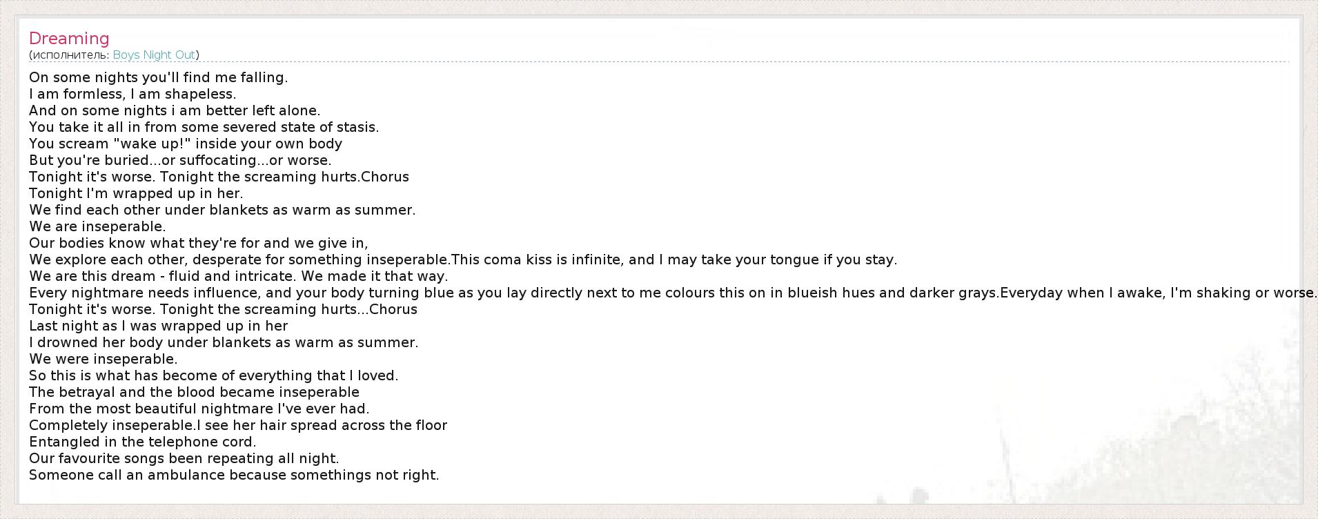 Every nightmare needs influence, and your body turning blue as you lay directly next to me colours this on in blueish hues and darker grays.Everyday when I awake, I'm shaking or worse.