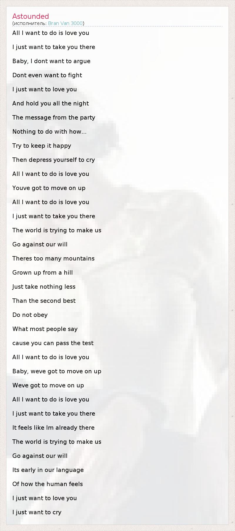 All I want to do is love you I just want to take you there Baby, I dont want to argue Dont even want to fight I just want to love you And hold you all the night The message from the party Nothing to do with how... Try to keep it happy Then depress yourself to cry All I want to do is love you Youve got to move on up All I want to do is love you I just want to take you there The world is trying to make us Go against our will Theres too many mountains Grown up from a hill Just take nothing less Than the second best Do not obey What most people say cause you can pass the test All I want to do is love you Baby, weve got to move on up Weve got to move on up All I want to do is love you I just want to take you there It feels like Im already there The world is trying to make us Go against our will Its early in our language Of how the human feels I just want to love you I just want to cry