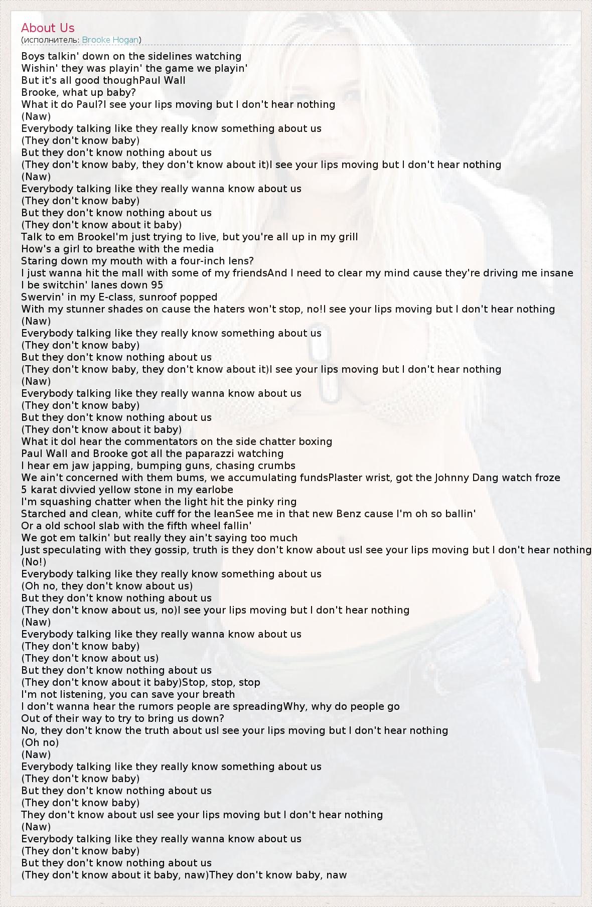 Boys talkin' down on the sidelines watching Wishin' they was playin' the game we playin' But it's all good thoughPaul Wall Brooke, what up baby? What it do Paul?I see your lips moving but I don't hear nothing (Naw) Everybody talking like they really know something about us (They don't know baby) But they don't know nothing about us (They don't know baby, they don't know about it)I see your lips moving but I don't hear nothing (Naw) Everybody talking like they really wanna know about us (They don't know baby) But they don't know nothing about us (They don't know about it baby) Talk to em BrookeI'm just trying to live, but you're all up in my grill How's a girl to breathe with the media Staring down my mouth with a four-inch lens? I just wanna hit the mall with some of my friendsAnd I need to clear my mind cause they're driving me insane I be switchin' lanes down 95 Swervin' in my E-class, sunroof popped With my stunner shades on cause the haters won't stop, no!I see your lips moving but I don't hear nothing (Naw) Everybody talking like they really know something about us (They don't know baby) But they don't know nothing about us (They don't know baby, they don't know about it)I see your lips moving but I don't hear nothing (Naw) Everybody talking like they really wanna know about us (They don't know baby) But they don't know nothing about us (They don't know about it baby) What it doI hear the commentators on the side chatter boxing Paul Wall and Brooke got all the paparazzi watching I hear em jaw japping, bumping guns, chasing crumbs We ain't concerned with them bums, we accumulating fundsPlaster wrist, got the Johnny Dang watch froze 5 karat divvied yellow stone in my earlobe I'm squashing chatter when the light hit the pinky ring Starched and clean, white cuff for the leanSee me in that new Benz cause I'm oh so ballin' Or a old school slab with the fifth wheel fallin' We got em talkin' but really they ain't saying too much Just speculating with they gossip, truth is they don't know about usI see your lips moving but I don't hear nothing (No!) Everybody talking like they really know something about us (Oh no, they don't know about us) But they don't know nothing about us (They don't know about us, no)I see your lips moving but I don't hear nothing (Naw) Everybody talking like they really wanna know about us (They don't know baby) (They don't know about us) But they don't know nothing about us (They don't know about it baby)Stop, stop, stop I'm not listening, you can save your breath I don't wanna hear the rumors people are spreadingWhy, why do people go Out of their way to try to bring us down? No, they don't know the truth about usI see your lips moving but I don't hear nothing (Oh no) (Naw) Everybody talking like they really know something about us (They don't know baby) But they don't know nothing about us (They don't know baby) They don't know about usI see your lips moving but I don't hear nothing (Naw) Everybody talking like they really wanna know about us (They don't know baby) But they don't know nothing about us (They don't know about it baby, naw)They don't know baby, naw