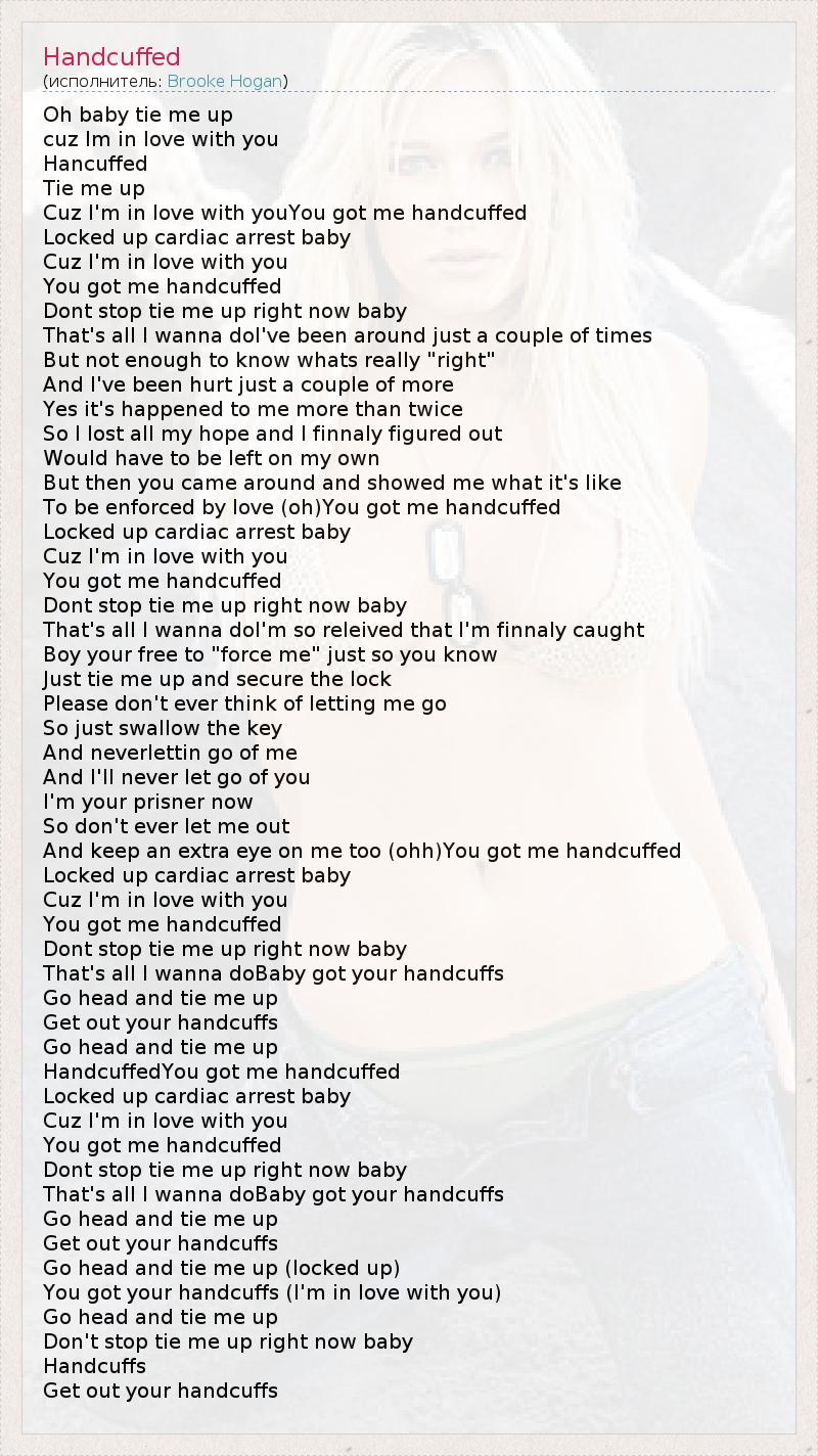 Oh baby tie me up cuz Im in love with you Hancuffed Tie me up Cuz I'm in love with youYou got me handcuffed Locked up cardiac arrest baby Cuz I'm in love with you You got me handcuffed Dont stop tie me up right now baby That's all I wanna doI've been around just a couple of times But not enough to know whats really "right" And I've been hurt just a couple of more Yes it's happened to me more than twice So I lost all my hope and I finnaly figured out Would have to be left on my own But then you came around and showed me what it's like To be enforced by love (oh)You got me handcuffed Locked up cardiac arrest baby Cuz I'm in love with you You got me handcuffed Dont stop tie me up right now baby That's all I wanna doI'm so releived that I'm finnaly caught Boy your free to "force me" just so you know Just tie me up and secure the lock Please don't ever think of letting me go So just swallow the key And neverlettin go of me And I'll never let go of you I'm your prisner now So don't ever let me out And keep an extra eye on me too (ohh)You got me handcuffed Locked up cardiac arrest baby Cuz I'm in love with you You got me handcuffed Dont stop tie me up right now baby That's all I wanna doBaby got your handcuffs Go head and tie me up Get out your handcuffs Go head and tie me up HandcuffedYou got me handcuffed Locked up cardiac arrest baby Cuz I'm in love with you You got me handcuffed Dont stop tie me up right now baby That's all I wanna doBaby got your handcuffs Go head and tie me up Get out your handcuffs Go head and tie me up (locked up) You got your handcuffs (I'm in love with you) Go head and tie me up Don't stop tie me up right now baby Handcuffs Get out your handcuffs