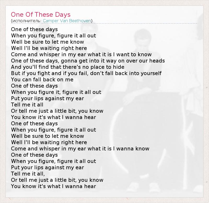 One of these days When you figure, figure it all out Well be sure to let me know Well I'll be waiting right here Come and whisper in my ear what it is I want to know One of these days, gonna get into it way on over our heads And you'll find that there's no place to hide But if you fight and if you fail, don't fall back into yourself You can fall back on me One of these days When you figure it, figure it all out Put your lips against my ear Tell me it all Or tell me just a little bit, you know You know it's what I wanna hear One of these days When you figure, figure it all out Well be sure to let me know Well I'll be waiting right here Come and whisper in my ear what it is I wanna know One of these days When you figure, figure it all out Put your lips against my ear Tell me it all, Or tell me just a little bit, you know You know it's what I wanna hear