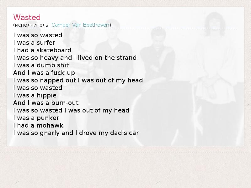I was so wasted I was a surfer I had a skateboard I was so heavy and I lived on the strand I was a dumb shit And I was a fuck-up I was so napped out I was out of my head I was so wasted I was a hippie And I was a burn-out I was so wasted I was out of my head I was a punker I had a mohawk I was so gnarly and I drove my dad's car