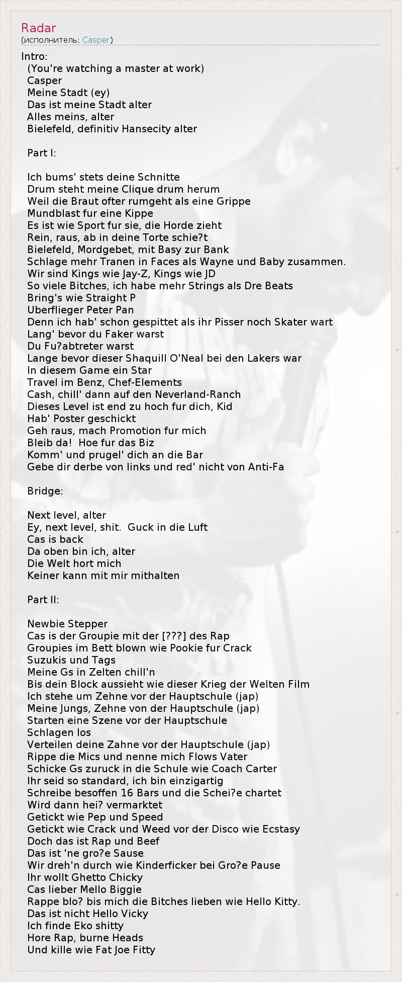 Intro: (You're watching a master at work) Casper Meine Stadt (ey) Das ist meine Stadt alter Alles meins, alter Bielefeld, definitiv Hansecity alter Part I: Ich bums' stets deine Schnitte Drum steht meine Clique drum herum Weil die Braut ofter rumgeht als eine Grippe Mundblast fur eine Kippe Es ist wie Sport fur sie, die Horde zieht Rein, raus, ab in deine Torte schie?t Bielefeld, Mordgebet, mit Basy zur Bank Schlage mehr Tranen in Faces als Wayne und Baby zusammen. Wir sind Kings wie Jay-Z, Kings wie JD So viele Bitches, ich habe mehr Strings als Dre Beats Bring's wie Straight P Uberflieger Peter Pan Denn ich hab' schon gespittet als ihr Pisser noch Skater wart Lang' bevor du Faker warst Du Fu?abtreter warst Lange bevor dieser Shaquill O'Neal bei den Lakers war In diesem Game ein Star Travel im Benz, Chef-Elements Cash, chill' dann auf den Neverland-Ranch Dieses Level ist end zu hoch fur dich, Kid Hab' Poster geschickt Geh raus, mach Promotion fur mich Bleib da! Hoe fur das Biz Komm' und prugel' dich an die Bar Gebe dir derbe von links und red' nicht von Anti-Fa Bridge: Next level, alter Ey, next level, shit. Guck in die Luft Cas is back Da oben bin ich, alter Die Welt hort mich Keiner kann mit mir mithalten Part II: Newbie Stepper Cas is der Groupie mit der [???] des Rap Groupies im Bett blown wie Pookie fur Crack Suzukis und Tags Meine Gs in Zelten chill'n Bis dein Block aussieht wie dieser Krieg der Welten Film Ich stehe um Zehne vor der Hauptschule (jap) Meine Jungs, Zehne von der Hauptschule (jap) Starten eine Szene vor der Hauptschule Schlagen los Verteilen deine Zahne vor der Hauptschule (jap) Rippe die Mics und nenne mich Flows Vater Schicke Gs zuruck in die Schule wie Coach Carter Ihr seid so standard, ich bin einzigartig Schreibe besoffen 16 Bars und die Schei?e chartet Wird dann hei? vermarktet Getickt wie Pep und Speed Getickt wie Crack und Weed vor der Disco wie Ecstasy Doch das ist Rap und Beef Das ist 'ne gro?e Sause Wir dreh'n durch wie Kinderficker bei Gro?e Pause Ihr wollt Ghetto Chicky Cas lieber Mello Biggie Rappe blo? bis mich die Bitches lieben wie Hello Kitty. Das ist nicht Hello Vicky Ich finde Eko shitty Hore Rap, burne Heads Und kille wie Fat Joe Fitty
