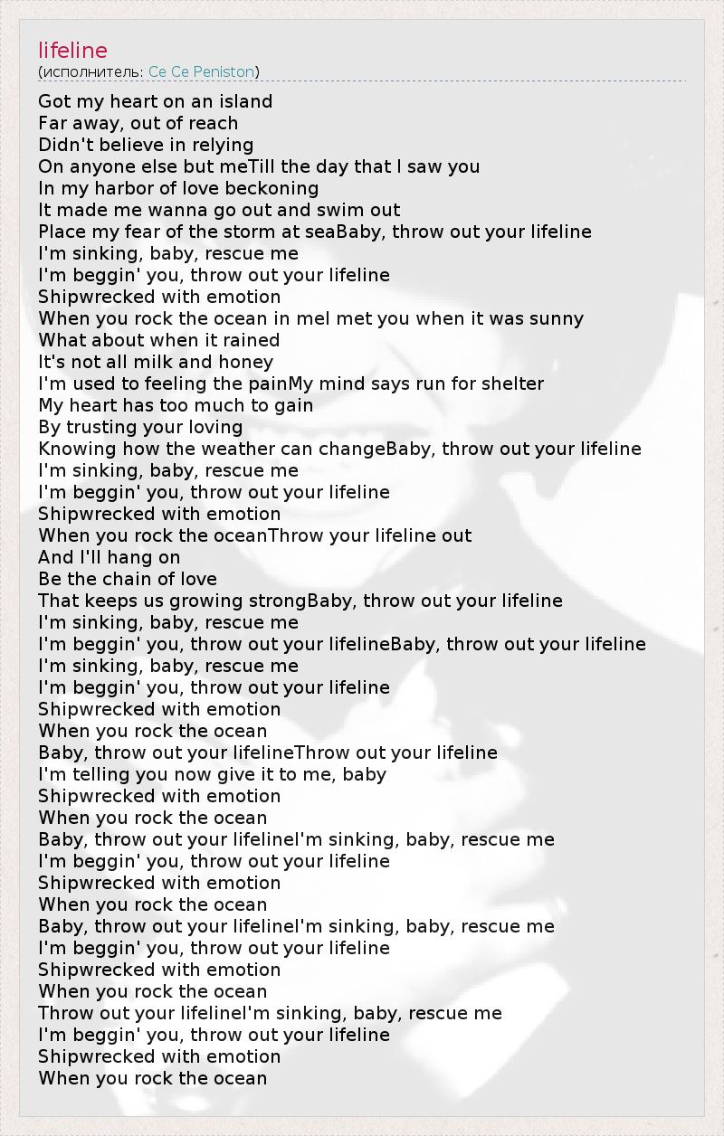 Got my heart on an island Far away, out of reach Didn't believe in relying On anyone else but meTill the day that I saw you In my harbor of love beckoning It made me wanna go out and swim out Place my fear of the storm at seaBaby, throw out your lifeline I'm sinking, baby, rescue me I'm beggin' you, throw out your lifeline Shipwrecked with emotion When you rock the ocean in meI met you when it was sunny What about when it rained It's not all milk and honey I'm used to feeling the painMy mind says run for shelter My heart has too much to gain By trusting your loving Knowing how the weather can changeBaby, throw out your lifeline I'm sinking, baby, rescue me I'm beggin' you, throw out your lifeline Shipwrecked with emotion When you rock the oceanThrow your lifeline out And I'll hang on Be the chain of love That keeps us growing strongBaby, throw out your lifeline I'm sinking, baby, rescue me I'm beggin' you, throw out your lifelineBaby, throw out your lifeline I'm sinking, baby, rescue me I'm beggin' you, throw out your lifeline Shipwrecked with emotion When you rock the ocean Baby, throw out your lifelineThrow out your lifeline I'm telling you now give it to me, baby Shipwrecked with emotion When you rock the ocean Baby, throw out your lifelineI'm sinking, baby, rescue me I'm beggin' you, throw out your lifeline Shipwrecked with emotion When you rock the ocean Baby, throw out your lifelineI'm sinking, baby, rescue me I'm beggin' you, throw out your lifeline Shipwrecked with emotion When you rock the ocean Throw out your lifelineI'm sinking, baby, rescue me I'm beggin' you, throw out your lifeline Shipwrecked with emotion When you rock the ocean