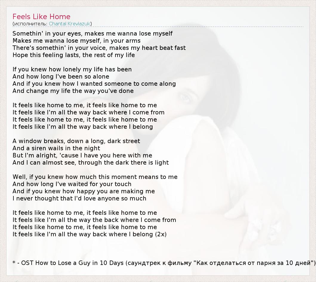 Somethin' in your eyes, makes me wanna lose myself Makes me wanna lose myself, in your arms There's somethin' in your voice, makes my heart beat fast Hope this feeling lasts, the rest of my life If you knew how lonely my life has been And how long I've been so alone And if you knew how I wanted someone to come along And change my life the way you've done It feels like home to me, it feels like home to me It feels like I'm all the way back where I come from It feels like home to me, it feels like home to me It feels like I'm all the way back where I belong A window breaks, down a long, dark street And a siren wails in the night But I'm alright, 'cause I have you here with me And I can almost see, through the dark there is light Well, if you knew how much this moment means to me And how long I've waited for your touch And if you knew how happy you are making me I never thought that I'd love anyone so much It feels like home to me, it feels like home to me It feels like I'm all the way the back where I come from It feels like home to me, it feels like home to me It feels like I'm all the way back where I belong (2x) * - OST How to Lose a Guy in 10 Days (саундтрек к фильму "Как отделаться от парня за 10 дней")