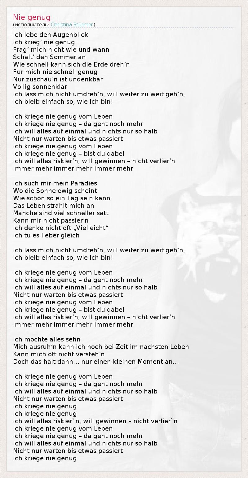Ich lebe den Augenblick Ich krieg’ nie genug Frag’ mich nicht wie und wann Schalt’ den Sommer an Wie schnell kann sich die Erde dreh’n Fur mich nie schnell genug Nur zuschau’n ist undenkbar Vollig sonnenklar Ich lass mich nicht umdreh‘n, will weiter zu weit geh‘n, ich bleib einfach so, wie ich bin! Ich kriege nie genug vom Leben Ich kriege nie genug – da geht noch mehr Ich will alles auf einmal und nichts nur so halb Nicht nur warten bis etwas passiert Ich kriege nie genug vom Leben Ich kriege nie genug – bist du dabei Ich will alles riskier’n, will gewinnen – nicht verlier’n Immer mehr immer mehr immer mehr Ich such mir mein Paradies Wo die Sonne ewig scheint Wie schon so ein Tag sein kann Das Leben strahlt mich an Manche sind viel schneller satt Kann mir nicht passier’n Ich denke nicht oft „Vielleicht“ Ich tu es lieber gleich Ich lass mich nicht umdreh‘n, will weiter zu weit geh‘n, ich bleib einfach so, wie ich bin! Ich kriege nie genug vom Leben Ich kriege nie genug – da geht noch mehr Ich will alles auf einmal und nichts nur so halb Nicht nur warten bis etwas passiert Ich kriege nie genug vom Leben Ich kriege nie genug – bist du dabei Ich will alles riskier’n, will gewinnen – nicht verlier’n Immer mehr immer mehr immer mehr Ich mochte alles sehn Mich ausruh’n kann ich noch bei Zeit im nachsten Leben Kann mich oft nicht versteh’n Doch das halt dann… nur einen kleinen Moment an… Ich kriege nie genug vom Leben Ich kriege nie genug – da geht noch mehr Ich will alles auf einmal und nichts nur so halb Nicht nur warten bis etwas passiert Ich kriege nie genug Ich kriege nie genug Ich will alles riskier`n, will gewinnen – nicht verlier`n Ich kriege nie genug vom Leben Ich kriege nie genug – da geht noch mehr Ich will alles auf einmal und nichts nur so halb Nicht nur warten bis etwas passiert Ich kriege nie genug