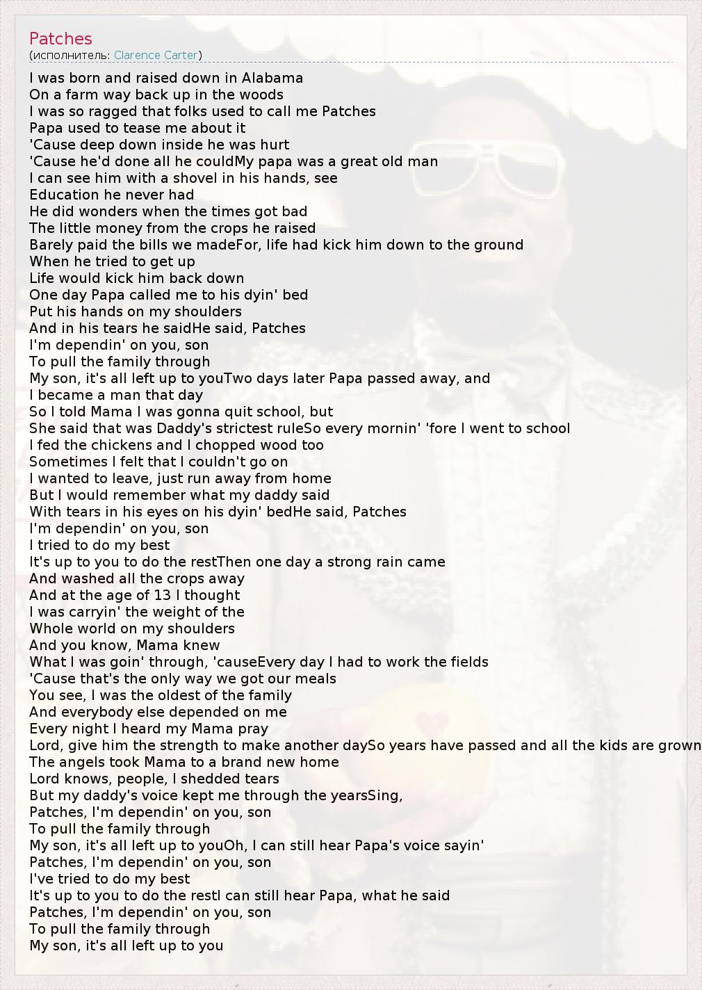 Это интересно:Clarence Carter (born 14 January 1936, Montgomery, Alabama) is a singer and musician. Carter's earliest releases were as half of the duo Clarence And Calvin. Also known as the "C And C Boys", the blind duo made seven singles, the last of which was recorded at Fame's Muscle Shoals studio. When his partner, Calvin Thomas (aka Scott), suffered serious injuries in a car accident in 1966, Carter became a solo act (Calvin himself later reappeared as a solo act to record two Dave Crawford-produced Atco Records singles in 1969-70 and a Clarence Paul-produced 1971 album for Stax Records…"The Feeling Is Right," "Doing Our Thing" and "Patches." "Patches"... продолжение