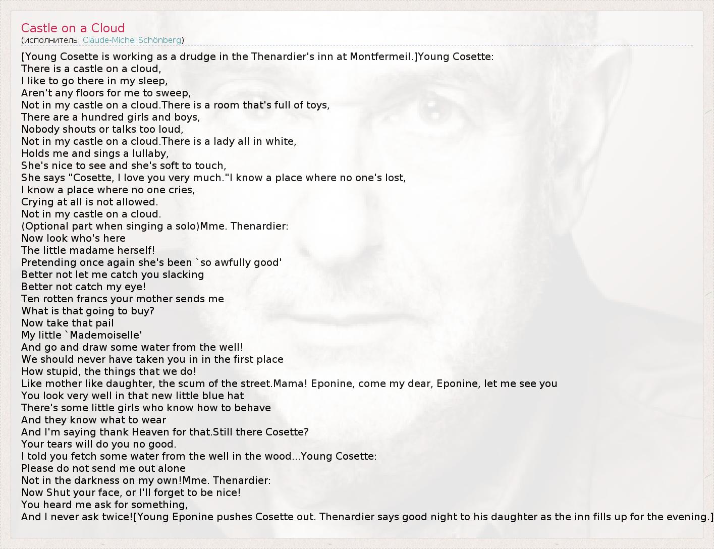 [Young Cosette is working as a drudge in the Thenardier's inn at Montfermeil.]Young Cosette: There is a castle on a cloud, I like to go there in my sleep, Aren't any floors for me to sweep, Not in my castle on a cloud.There is a room that's full of toys, There are a hundred girls and boys, Nobody shouts or talks too loud, Not in my castle on a cloud.There is a lady all in white, Holds me and sings a lullaby, She's nice to see and she's soft to touch, She says "Cosette, I love you very much."I know a place where no one's lost, I know a place where no one cries, Crying at all is not allowed. Not in my castle on a cloud. (Optional part when singing a solo)Mme. Thenardier: Now look who's here The little madame herself! Pretending once again she's been `so awfully good' Better not let me catch you slacking Better not catch my eye! Ten rotten francs your mother sends me What is that going to buy? Now take that pail My little `Mademoiselle' And go and draw some water from the well! We should never have taken you in in the first place How stupid, the things that we do! Like mother like daughter, the scum of the street.Mama! Eponine, come my dear, Eponine, let me see you You look very well in that new little blue hat There's some little girls who know how to behave And they know what to wear And I'm saying thank Heaven for that.Still there Cosette? Your tears will do you no good. I told you fetch some water from the well in the wood...Young Cosette: Please do not send me out alone Not in the darkness on my own!Mme. Thenardier: Now Shut your face, or I'll forget to be nice! You heard me ask for something, And I never ask twice![Young Eponine pushes Cosette out. Thenardier says good night to his daughter as the inn fills up for the evening.]