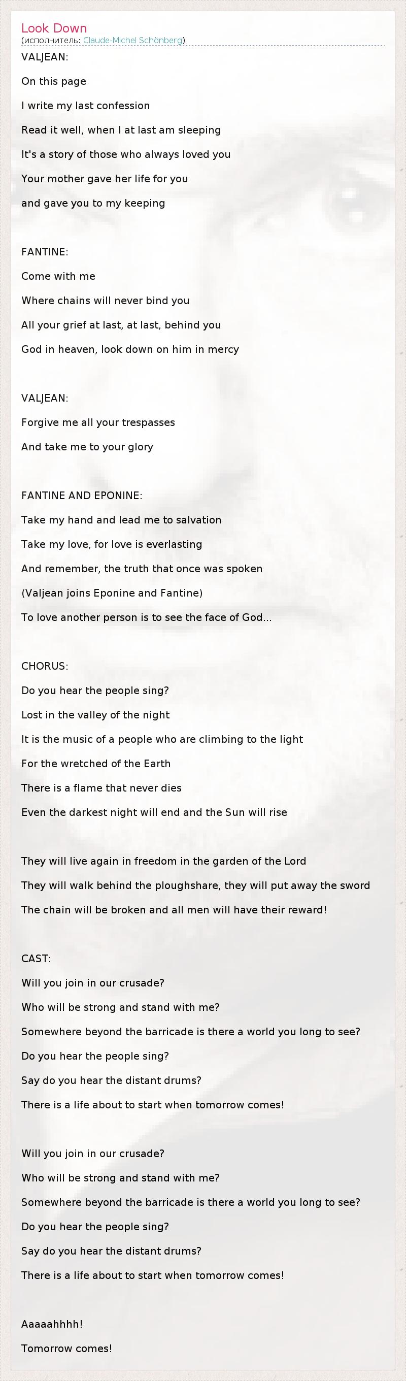 VALJEAN: On this page I write my last confession Read it well, when I at last am sleeping It's a story of those who always loved you Your mother gave her life for you and gave you to my keeping FANTINE: Come with me Where chains will never bind you All your grief at last, at last, behind you God in heaven, look down on him in mercy VALJEAN: Forgive me all your trespasses And take me to your glory FANTINE AND EPONINE: Take my hand and lead me to salvation Take my love, for love is everlasting And remember, the truth that once was spoken (Valjean joins Eponine and Fantine) To love another person is to see the face of God... CHORUS: Do you hear the people sing? Lost in the valley of the night It is the music of a people who are climbing to the light For the wretched of the Earth There is a flame that never dies Even the darkest night will end and the Sun will rise They will live again in freedom in the garden of the Lord They will walk behind the ploughshare, they will put away the sword The chain will be broken and all men will have their reward! CAST: Will you join in our crusade? Who will be strong and stand with me? Somewhere beyond the barricade is there a world you long to see? Do you hear the people sing? Say do you hear the distant drums? There is a life about to start when tomorrow comes! Will you join in our crusade? Who will be strong and stand with me? Somewhere beyond the barricade is there a world you long to see? Do you hear the people sing? Say do you hear the distant drums? There is a life about to start when tomorrow comes! Aaaaahhhh! Tomorrow comes!