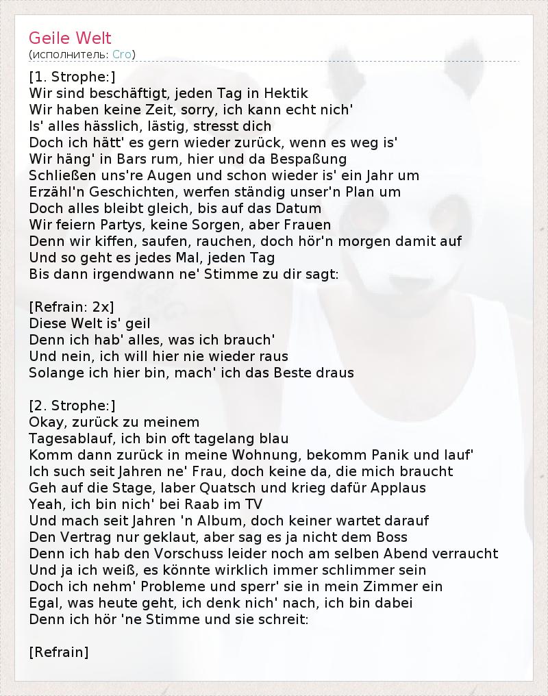 [1. Strophe:] Wir sind beschäftigt, jeden Tag in Hektik Wir haben keine Zeit, sorry, ich kann echt nich' Is' alles hässlich, lästig, stresst dich Doch ich hätt' es gern wieder zurück, wenn es weg is' Wir häng' in Bars rum, hier und da Bespaßung Schließen uns're Augen und schon wieder is' ein Jahr um Erzähl'n Geschichten, werfen ständig unser'n Plan um Doch alles bleibt gleich, bis auf das Datum Wir feiern Partys, keine Sorgen, aber Frauen Denn wir kiffen, saufen, rauchen, doch hör'n morgen damit auf Und so geht es jedes Mal, jeden Tag Bis dann irgendwann ne' Stimme zu dir sagt: [Refrain: 2x] Diese Welt is' geil Denn ich hab' alles, was ich brauch' Und nein, ich will hier nie wieder raus Solange ich hier bin, mach' ich das Beste draus [2. Strophe:] Okay, zurück zu meinem Tagesablauf, ich bin oft tagelang blau Komm dann zurück in meine Wohnung, bekomm Panik und lauf' Ich such seit Jahren ne' Frau, doch keine da, die mich braucht Geh auf die Stage, laber Quatsch und krieg dafür Applaus Yeah, ich bin nich' bei Raab im TV Und mach seit Jahren 'n Album, doch keiner wartet darauf Den Vertrag nur geklaut, aber sag es ja nicht dem Boss Denn ich hab den Vorschuss leider noch am selben Abend verraucht Und ja ich weiß, es könnte wirklich immer schlimmer sein Doch ich nehm' Probleme und sperr' sie in mein Zimmer ein Egal, was heute geht, ich denk nich' nach, ich bin dabei Denn ich hör 'ne Stimme und sie schreit: [Refrain]