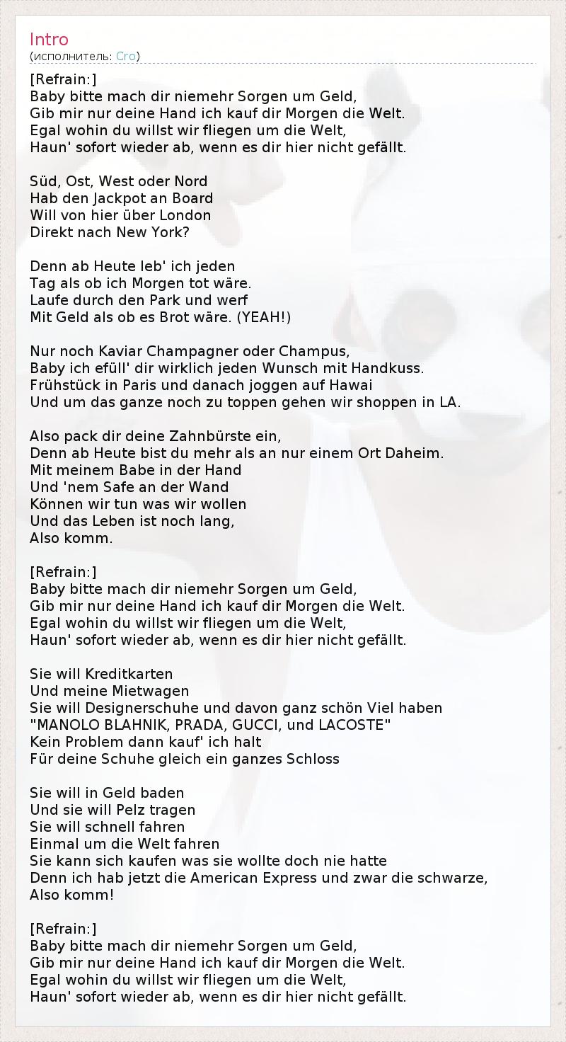 Это интересно:Cro (Карло Вайбель - Carlo Waibel род. 31 января 1990) немецкий репер. Он называет свою музыку как смесь рэпа и Поп-музыки, что он с термином „Raop“До Cro Карло назывался как Lyr1c и Карло BLAC CAT. Карло играет на пианино и гитаре. Карло начал писать музыку с 13 лет в домашней студии. В 2011 году Карло и Dj Псайко Дино (Маркус) записали трек Easy в Chimperator Productions (всего за день) после чего дали пару интервью и почти сразу... продолжение