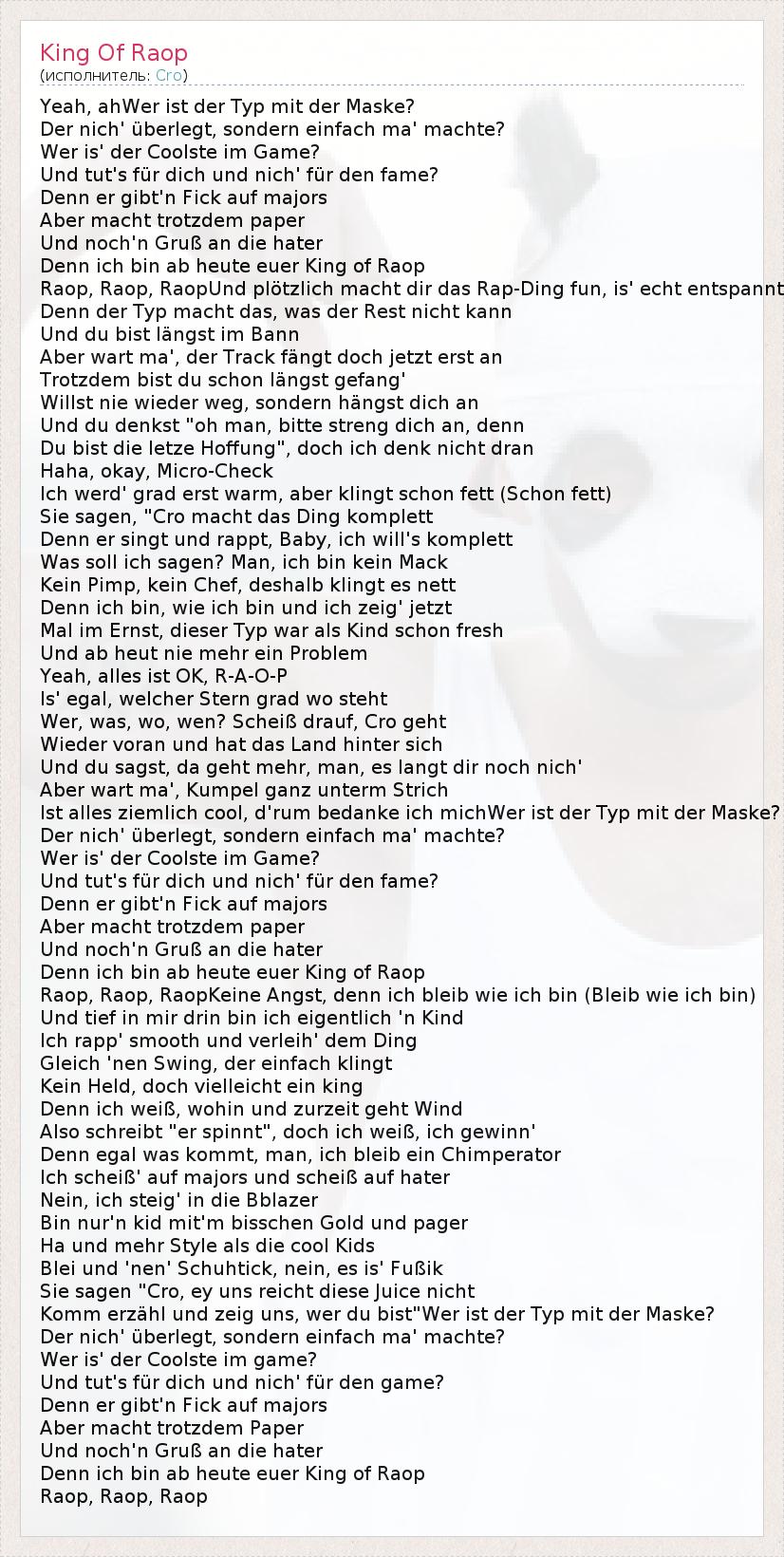 Yeah, ahWer ist der Typ mit der Maske? Der nich' überlegt, sondern einfach ma' machte? Wer is' der Coolste im Game? Und tut's für dich und nich' für den fame? Denn er gibt'n Fick auf majors Aber macht trotzdem paper Und noch'n Gruß an die hater Denn ich bin ab heute euer King of Raop Raop, Raop, RaopUnd plötzlich macht dir das Rap-Ding fun, is' echt entspannt Denn der Typ macht das, was der Rest nicht kann Und du bist längst im Bann Aber wart ma', der Track fängt doch jetzt erst an Trotzdem bist du schon längst gefang' Willst nie wieder weg, sondern hängst dich an Und du denkst "oh man, bitte streng dich an, denn Du bist die letze Hoffung", doch ich denk nicht dran Haha, okay, Micro-Check Ich werd' grad erst warm, aber klingt schon fett (Schon fett) Sie sagen, "Cro macht das Ding komplett Denn er singt und rappt, Baby, ich will's komplett Was soll ich sagen? Man, ich bin kein Mack Kein Pimp, kein Chef, deshalb klingt es nett Denn ich bin, wie ich bin und ich zeig' jetzt Mal im Ernst, dieser Typ war als Kind schon fresh Und ab heut nie mehr ein Problem Yeah, alles ist OK, R-A-O-P Is' egal, welcher Stern grad wo steht Wer, was, wo, wen? Scheiß drauf, Cro geht Wieder voran und hat das Land hinter sich Und du sagst, da geht mehr, man, es langt dir noch nich' Aber wart ma', Kumpel ganz unterm Strich Ist alles ziemlich cool, d'rum bedanke ich michWer ist der Typ mit der Maske? Der nich' überlegt, sondern einfach ma' machte? Wer is' der Coolste im Game? Und tut's für dich und nich' für den fame? Denn er gibt'n Fick auf majors Aber macht trotzdem paper Und noch'n Gruß an die hater Denn ich bin ab heute euer King of Raop Raop, Raop, RaopKeine Angst, denn ich bleib wie ich bin (Bleib wie ich bin) Und tief in mir drin bin ich eigentlich 'n Kind Ich rapp' smooth und verleih' dem Ding Gleich 'nen Swing, der einfach klingt Kein Held, doch vielleicht ein king Denn ich weiß, wohin und zurzeit geht Wind Also schreibt "er spinnt", doch ich weiß, ich gewinn' Denn egal was kommt, man, ich bleib ein Chimperator Ich scheiß' auf majors und scheiß auf hater Nein, ich steig' in die Bblazer Bin nur'n kid mit'm bisschen Gold und pager Ha und mehr Style als die cool Kids Blei und 'nen' Schuhtick, nein, es is' Fußik Sie sagen "Cro, ey uns reicht diese Juice nicht Komm erzähl und zeig uns, wer du bist"Wer ist der Typ mit der Maske? Der nich' überlegt, sondern einfach ma' machte? Wer is' der Coolste im game? Und tut's für dich und nich' für den game? Denn er gibt'n Fick auf majors Aber macht trotzdem Paper Und noch'n Gruß an die hater Denn ich bin ab heute euer King of Raop Raop, Raop, Raop