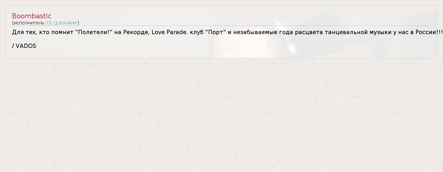 Для тех, кто помнит "Полетели!" на Рекорде, Love Parade. клуб "Порт" и незабываемые года расцвета танцевальной музыки у нас в России!!!