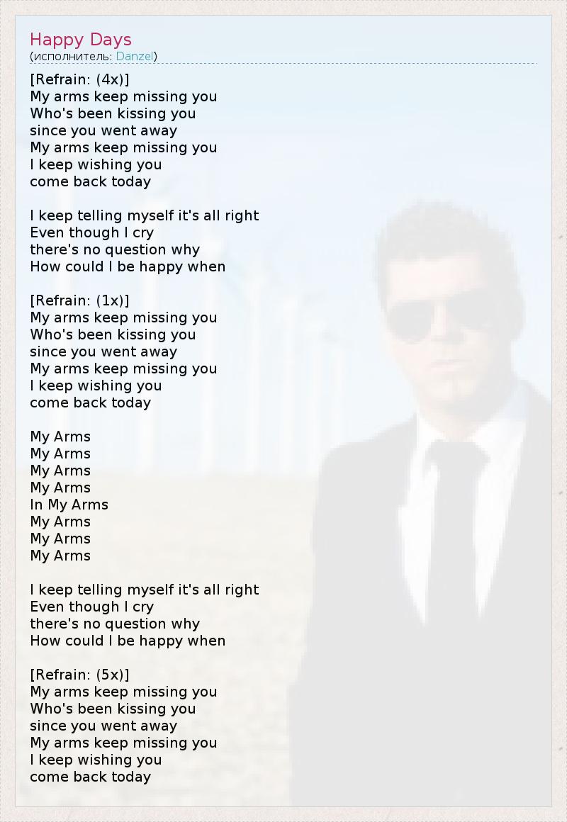 [Refrain: (4x)] My arms keep missing you Who's been kissing you since you went away My arms keep missing you I keep wishing you come back today I keep telling myself it's all right Even though I cry there's no question why How could I be happy when [Refrain: (1x)] My arms keep missing you Who's been kissing you since you went away My arms keep missing you I keep wishing you come back today My Arms My Arms My Arms My Arms In My Arms My Arms My Arms My Arms I keep telling myself it's all right Even though I cry there's no question why How could I be happy when [Refrain: (5x)] My arms keep missing you Who's been kissing you since you went away My arms keep missing you I keep wishing you come back today