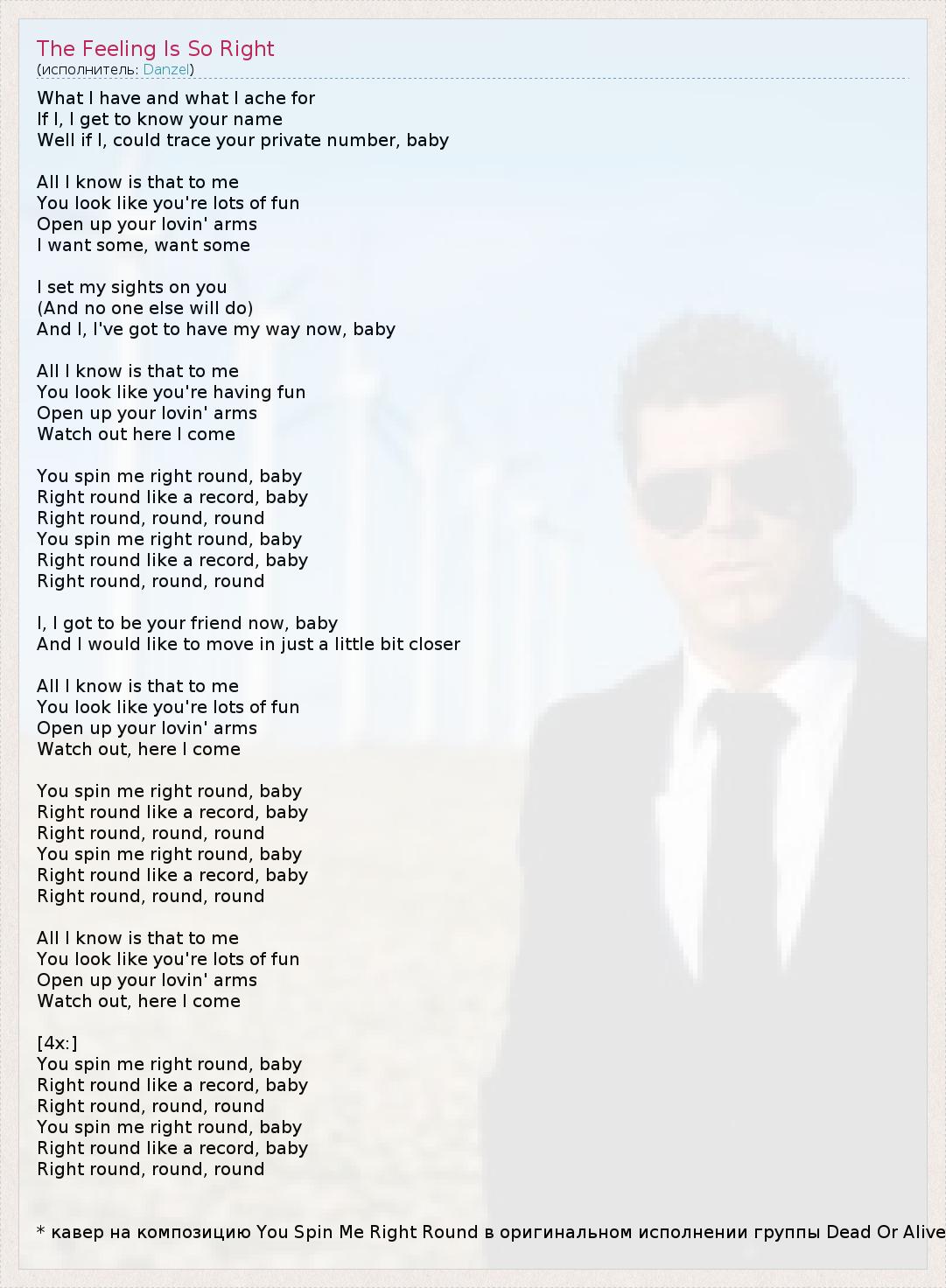 What I have and what I ache for If I, I get to know your name Well if I, could trace your private number, baby All I know is that to me You look like you're lots of fun Open up your lovin' arms I want some, want some I set my sights on you (And no one else will do) And I, I've got to have my way now, baby All I know is that to me You look like you're having fun Open up your lovin' arms Watch out here I come You spin me right round, baby Right round like a record, baby Right round, round, round You spin me right round, baby Right round like a record, baby Right round, round, round I, I got to be your friend now, baby And I would like to move in just a little bit closer All I know is that to me You look like you're lots of fun Open up your lovin' arms Watch out, here I come You spin me right round, baby Right round like a record, baby Right round, round, round You spin me right round, baby Right round like a record, baby Right round, round, round All I know is that to me You look like you're lots of fun Open up your lovin' arms Watch out, here I come [4x:] You spin me right round, baby Right round like a record, baby Right round, round, round You spin me right round, baby Right round like a record, baby Right round, round, round * кавер на композицию You Spin Me Right Round в оригинальном исполнении группы Dead Or Alive