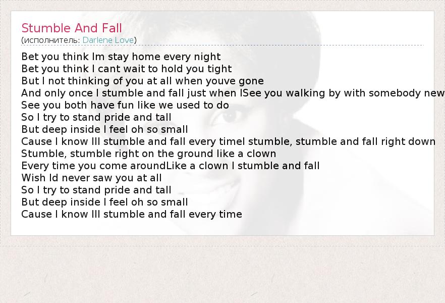 Bet you think Im stay home every night Bet you think I cant wait to hold you tight But I not thinking of you at all when youve gone And only once I stumble and fall just when ISee you walking by with somebody new See you both have fun like we used to do So I try to stand pride and tall But deep inside I feel oh so small Cause I know Ill stumble and fall every timeI stumble, stumble and fall right down Stumble, stumble right on the ground like a clown Every time you come aroundLike a clown I stumble and fall Wish Id never saw you at all So I try to stand pride and tall But deep inside I feel oh so small Cause I know Ill stumble and fall every time