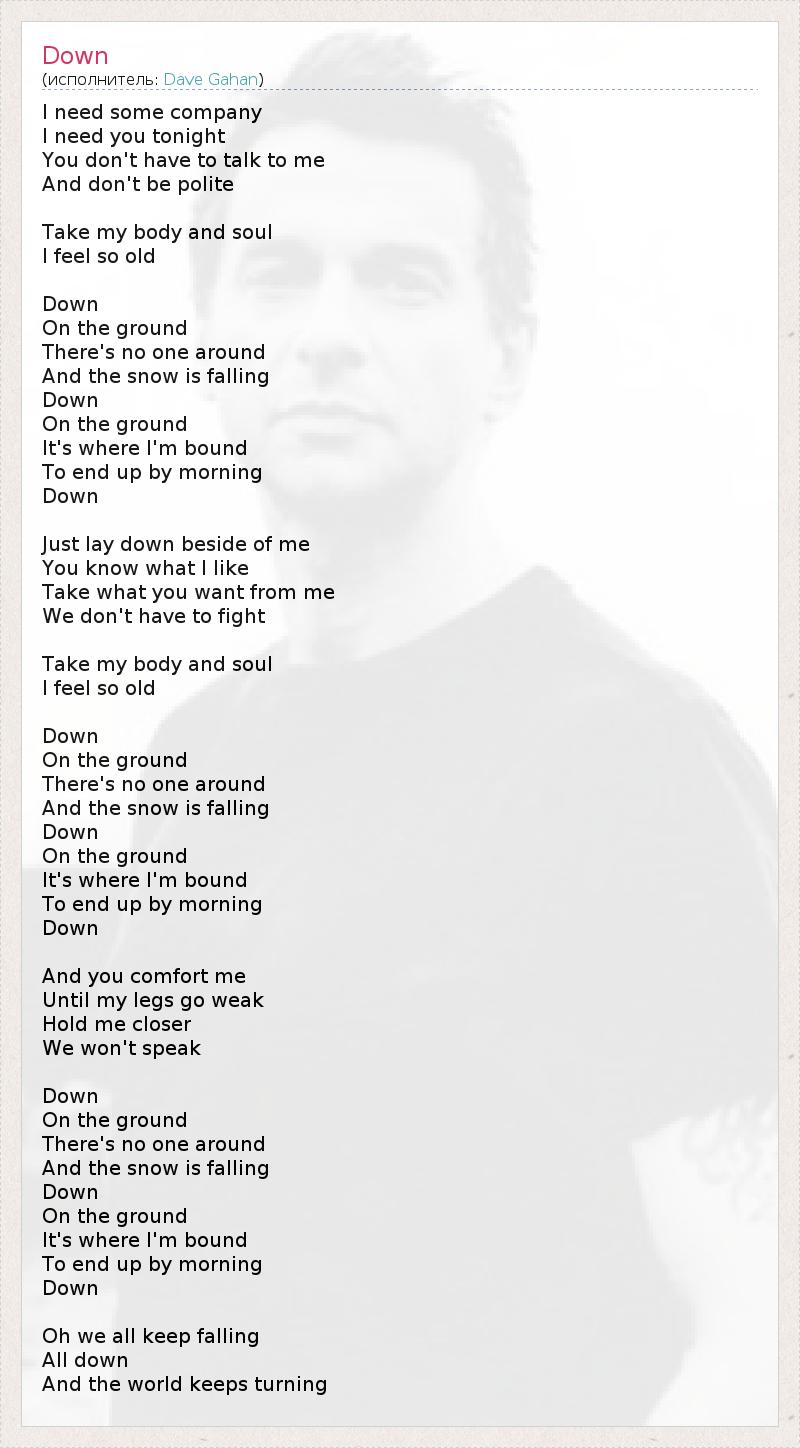 Мне нужна хоть какая-то компания, Ты нужна мне этой ночью. Ты не обязана со мной говорить Или быть вежливой. Прими мое тело и душу, Я чувствую себя стариком... Вниз, На землю, Где никого нет рядом, Падает снег, Вниз, На землю, Туда, где я готов Скончаться утром, Вниз... Просто ляг рядом со мной, Ты знаешь, что я люблю, Бери все, что захочешь, Мы не должны сопротивляться. Прими мое тело и душу, Я чувствую себя стариком... Вниз, На землю, Где никого нет рядом, Падает снег, Вниз, На землю, Туда, где я готов Скончаться утром, Вниз... Утешай меня, Пока у меня не подкосятся ноги, Держи меня крепко, Давай помолчим... Вниз, На землю, Где никого нет рядом, Падает снег, Вниз, На землю, Туда, где я готов Скончаться утром, Вниз... О, мы все продолжаем падать, Падать вниз, А Земля продолжает вращаться...