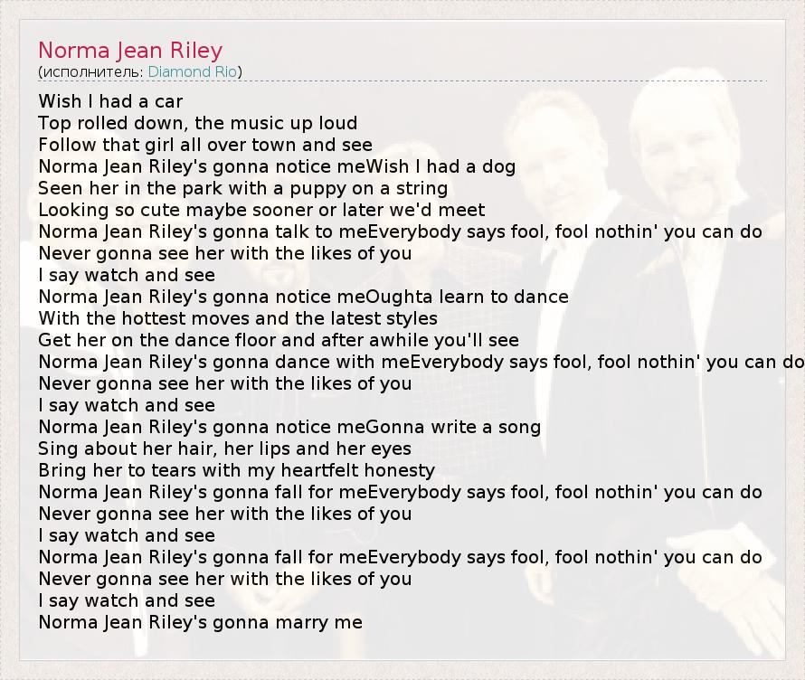 Norma Jean Riley's gonna dance with meEverybody says fool, fool nothin' you can do