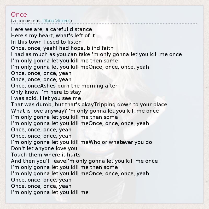 Here we are, a careful distance Here's my heart, what's left of it In this town I used to listen Once, once, yeahI had hope, blind faith I had as much as you can takeI'm only gonna let you kill me once I'm only gonna let you kill me then some I'm only gonna let you kill meOnce, once, once, yeah Once, once, once, yeah Once, once, once, yeah Once, onceAshes burn the morning after Only know I'm here to stay I was sold, I let you see me That was dumb, but that's okayTripping down to your place What is love anyway?I'm only gonna let you kill me once I'm only gonna let you kill me then some I'm only gonna let you kill meOnce, once, once, yeah Once, once, once, yeah Once, once, once, yeah I'm only gonna let you kill meWho or whatever you do Don't let anyone love you Touch them where it hurts And then you'll leaveI'm only gonna let you kill me once I'm only gonna let you kill me then some I'm only gonna let you kill meOnce, once, once, yeah Once, once, once, yeah Once, once, once, yeah I'm only gonna let you kill me