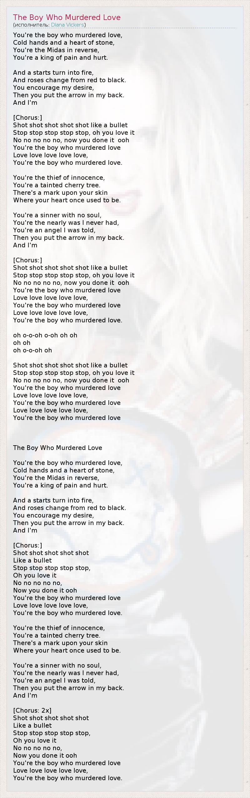 You're the boy who murdered love, Cold hands and a heart of stone, You're the Midas in reverse, You're a king of pain and hurt. And a starts turn into fire, And roses change from red to black. You encourage my desire, Then you put the arrow in my back. And I'm [Chorus:] Shot shot shot shot shot like a bullet Stop stop stop stop stop, oh you love it No no no no no, now you done it ooh You're the boy who murdered love Love love love love love, You're the boy who murdered love. You're the thief of innocence, You're a tainted cherry tree. There's a mark upon your skin Where your heart once used to be. You're a sinner with no soul, You're the nearly was I never had, You're an angel I was told, Then you put the arrow in my back. And I'm [Chorus:] Shot shot shot shot shot like a bullet Stop stop stop stop stop, oh you love it No no no no no, now you done it ooh You're the boy who murdered love Love love love love love, You're the boy who murdered love Love love love love love, You're the boy who murdered love. oh o-o-oh o-oh oh oh oh oh oh o-o-oh oh Shot shot shot shot shot like a bullet Stop stop stop stop stop, oh you love it No no no no no, now you done it ooh You're the boy who murdered love Love love love love love, You're the boy who murdered love Love love love love love, You're the boy who murdered love The Boy Who Murdered Love You're the boy who murdered love, Cold hands and a heart of stone, You're the Midas in reverse, You're a king of pain and hurt. And a starts turn into fire, And roses change from red to black. You encourage my desire, Then you put the arrow in my back. And I'm [Chorus:] Shot shot shot shot shot Like a bullet Stop stop stop stop stop, Oh you love it No no no no no, Now you done it ooh You're the boy who murdered love Love love love love love, You're the boy who murdered love. You're the thief of innocence, You're a tainted cherry tree. There's a mark upon your skin Where your heart once used to be. You're a sinner with no soul, You're the nearly was I never had, You're an angel I was told, Then you put the arrow in my back. And I'm [Chorus: 2x] Shot shot shot shot shot Like a bullet Stop stop stop stop stop, Oh you love it No no no no no, Now you done it ooh You're the boy who murdered love Love love love love love, You're the boy who murdered love.
