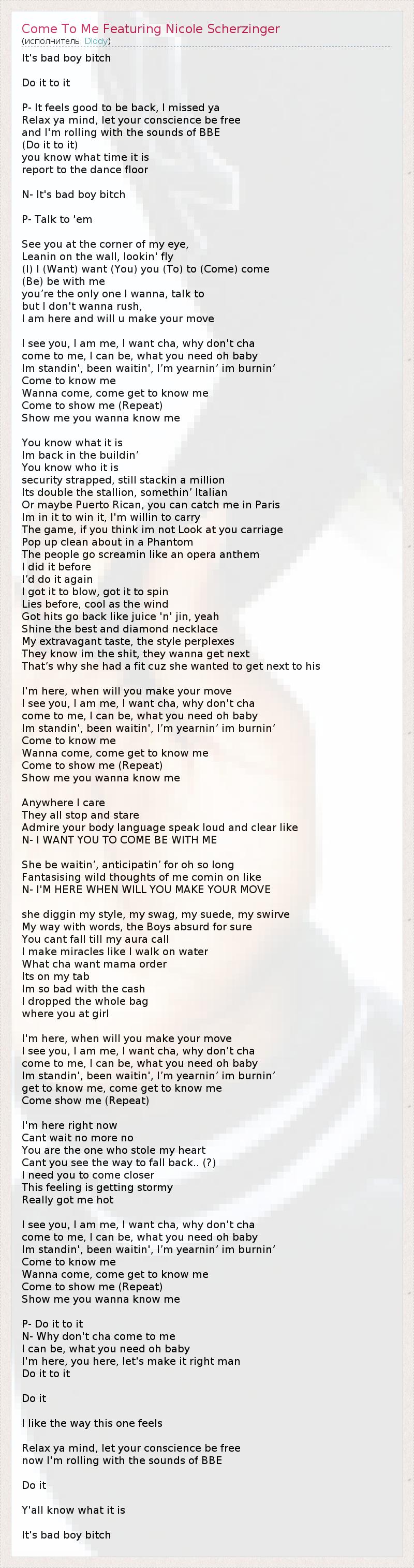 ГлавнаяИсполнителиDiddyCome To Me Featuring Nicole Scherzinger
