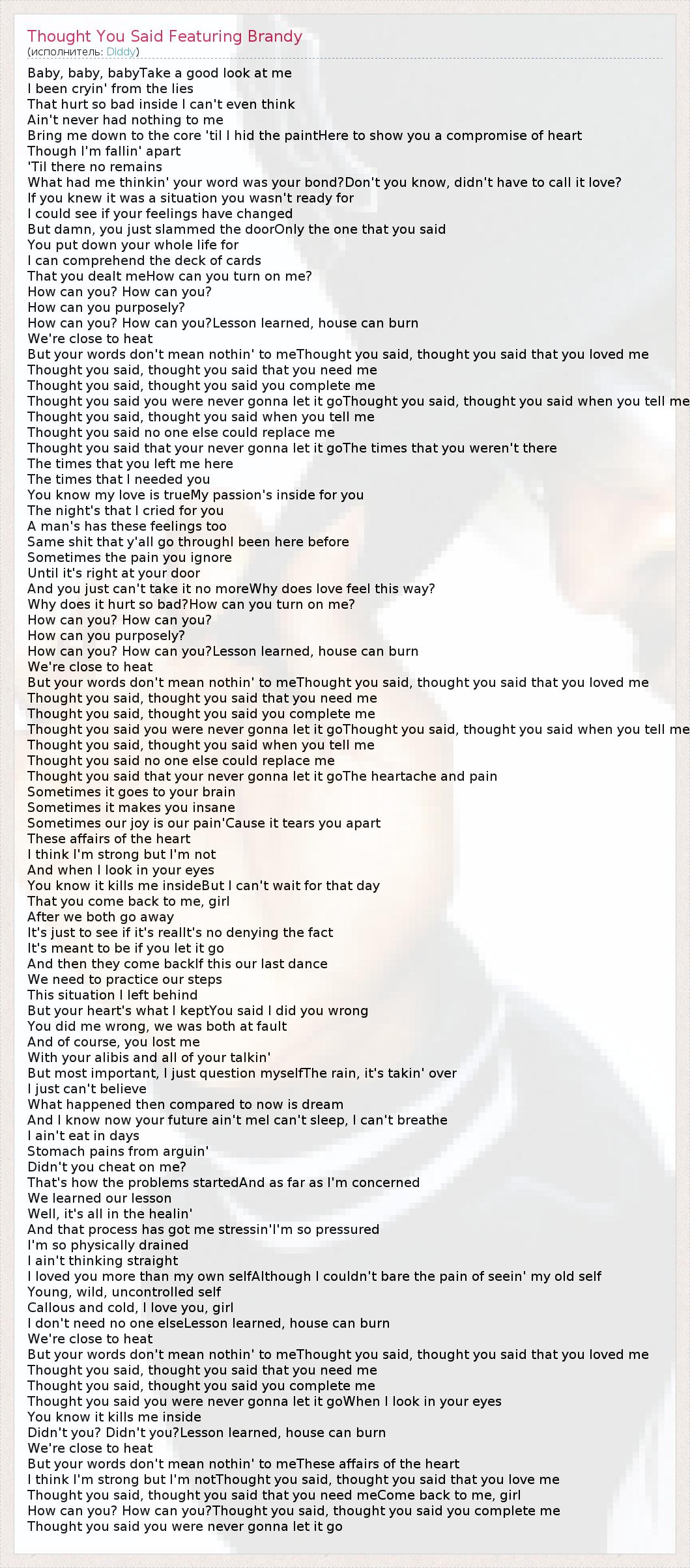 ГлавнаяИсполнителиDiddyThought You Said Featuring Brandy