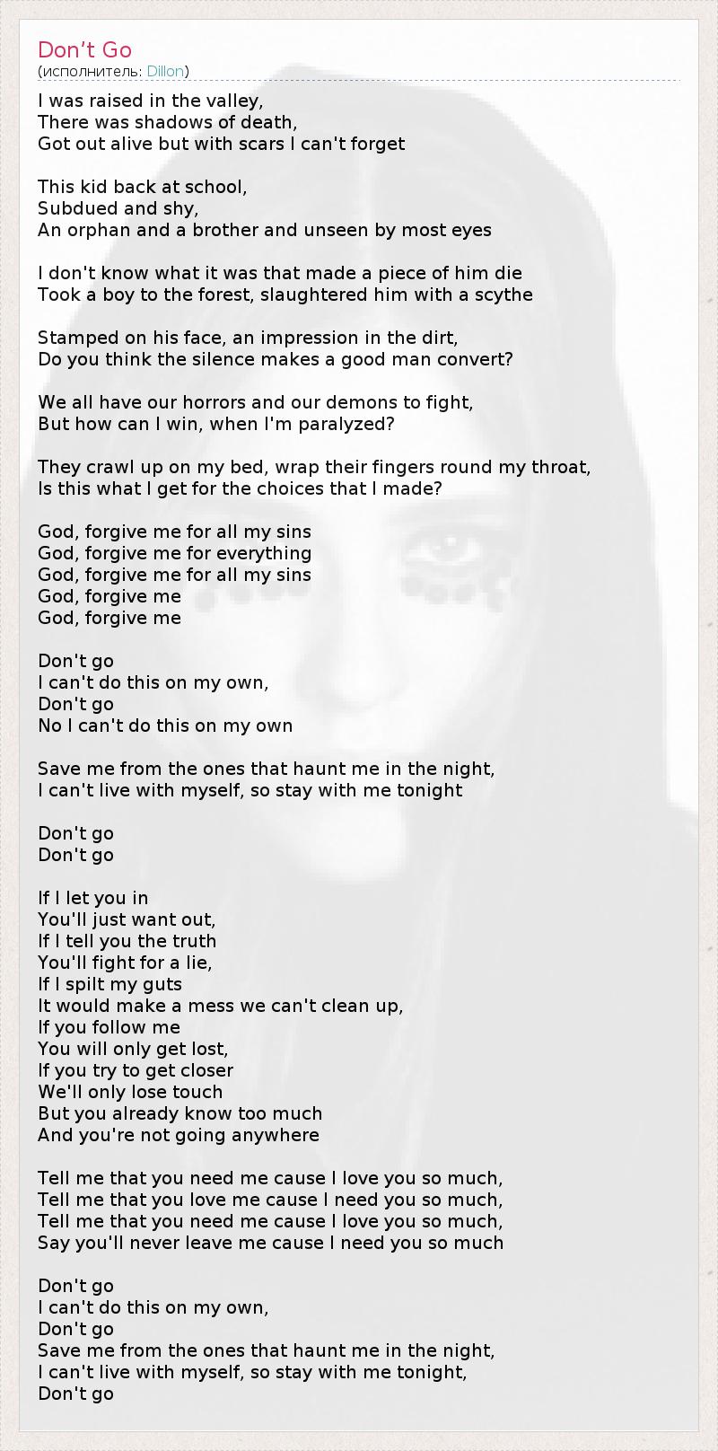 I was raised in the valley, There was shadows of death, Got out alive but with scars I can't forget This kid back at school, Subdued and shy, An orphan and a brother and unseen by most eyes I don't know what it was that made a piece of him die Took a boy to the forest, slaughtered him with a scythe Stamped on his face, an impression in the dirt, Do you think the silence makes a good man convert? We all have our horrors and our demons to fight, But how can I win, when I'm paralyzed? They crawl up on my bed, wrap their fingers round my throat, Is this what I get for the choices that I made? God, forgive me for all my sins God, forgive me for everything God, forgive me for all my sins God, forgive me God, forgive me Don't go I can't do this on my own, Don't go No I can't do this on my own Save me from the ones that haunt me in the night, I can't live with myself, so stay with me tonight Don't go Don't go If I let you in You'll just want out, If I tell you the truth You'll fight for a lie, If I spilt my guts It would make a mess we can't clean up, If you follow me You will only get lost, If you try to get closer We'll only lose touch But you already know too much And you're not going anywhere Tell me that you need me cause I love you so much, Tell me that you love me cause I need you so much, Tell me that you need me cause I love you so much, Say you'll never leave me cause I need you so much Don't go I can't do this on my own, Don't go Save me from the ones that haunt me in the night, I can't live with myself, so stay with me tonight, Don't go