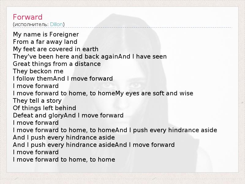 My name is Foreigner From a far away land My feet are covered in earth They've been here and back againAnd I have seen Great things from a distance They beckon me I follow themAnd I move forward I move forward I move forward to home, to homeMy eyes are soft and wise They tell a story Of things left behind Defeat and gloryAnd I move forward I move forward I move forward to home, to homeAnd I push every hindrance aside And I push every hindrance aside And I push every hindrance asideAnd I move forward I move forward I move forward to home, to home