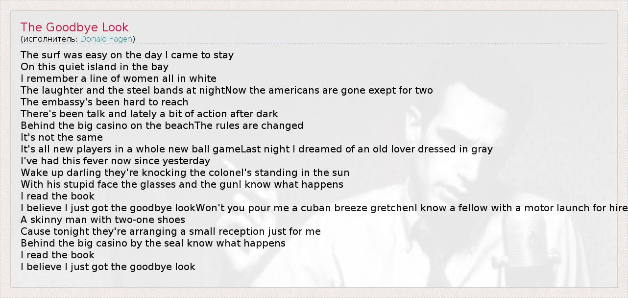 The surf was easy on the day I came to stay On this quiet island in the bay I remember a line of women all in white The laughter and the steel bands at nightNow the americans are gone exept for two The embassy's been hard to reach There's been talk and lately a bit of action after dark Behind the big casino on the beachThe rules are changed It's not the same It's all new players in a whole new ball gameLast night I dreamed of an old lover dressed in gray I've had this fever now since yesterday Wake up darling they're knocking the colonel's standing in the sun With his stupid face the glasses and the gunI know what happens I read the book I believe I just got the goodbye lookWon't you pour me a cuban breeze gretchenI know a fellow with a motor launch for hire A skinny man with two-one shoes Cause tonight they're arranging a small reception just for me Behind the big casino by the seaI know what happens I read the book I believe I just got the goodbye look