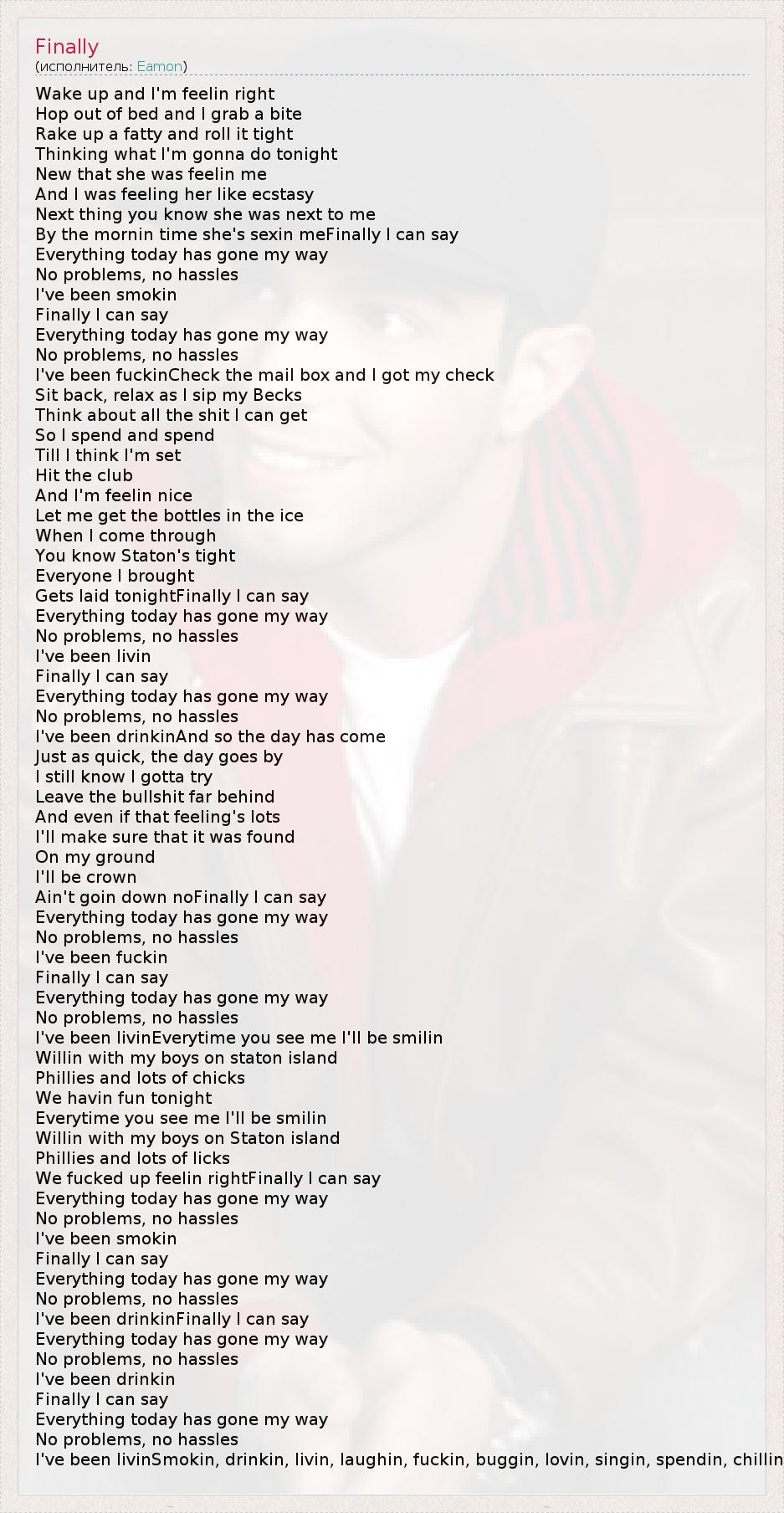 Wake up and I'm feelin right Hop out of bed and I grab a bite Rake up a fatty and roll it tight Thinking what I'm gonna do tonight New that she was feelin me And I was feeling her like ecstasy Next thing you know she was next to me By the mornin time she's sexin meFinally I can say Everything today has gone my way No problems, no hassles I've been smokin Finally I can say Everything today has gone my way No problems, no hassles I've been fuckinCheck the mail box and I got my check Sit back, relax as I sip my Becks Think about all the shit I can get So I spend and spend Till I think I'm set Hit the club And I'm feelin nice Let me get the bottles in the ice When I come through You know Staton's tight Everyone I brought Gets laid tonightFinally I can say Everything today has gone my way No problems, no hassles I've been livin Finally I can say Everything today has gone my way No problems, no hassles I've been drinkinAnd so the day has come Just as quick, the day goes by I still know I gotta try Leave the bullshit far behind And even if that feeling's lots I'll make sure that it was found On my ground I'll be crown Ain't goin down noFinally I can say Everything today has gone my way No problems, no hassles I've been fuckin Finally I can say Everything today has gone my way No problems, no hassles I've been livinEverytime you see me I'll be smilin Willin with my boys on staton island Phillies and lots of chicks We havin fun tonight Everytime you see me I'll be smilin Willin with my boys on Staton island Phillies and lots of licks We fucked up feelin rightFinally I can say Everything today has gone my way No problems, no hassles I've been smokin Finally I can say Everything today has gone my way No problems, no hassles I've been drinkinFinally I can say Everything today has gone my way No problems, no hassles I've been drinkin Finally I can say Everything today has gone my way No problems, no hassles I've been livinSmokin, drinkin, livin, laughin, fuckin, buggin, lovin, singin, spendin, chillin
