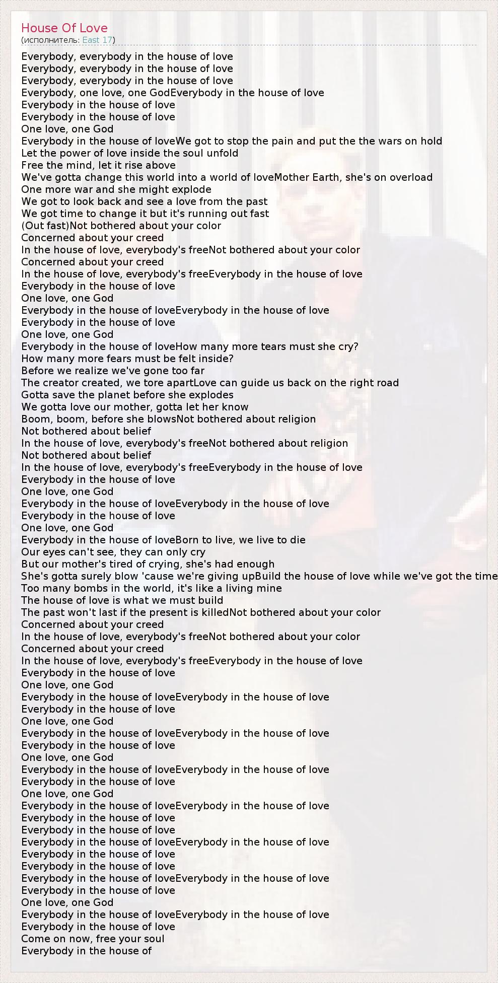 Everybody, everybody in the house of love Everybody, everybody in the house of love Everybody, everybody in the house of love Everybody, one love, one GodEverybody in the house of love Everybody in the house of love Everybody in the house of love One love, one God Everybody in the house of loveWe got to stop the pain and put the the wars on hold Let the power of love inside the soul unfold Free the mind, let it rise above We've gotta change this world into a world of loveMother Earth, she's on overload One more war and she might explode We got to look back and see a love from the past We got time to change it but it's running out fast (Out fast)Not bothered about your color Concerned about your creed In the house of love, everybody's freeNot bothered about your color Concerned about your creed In the house of love, everybody's freeEverybody in the house of love Everybody in the house of love One love, one God Everybody in the house of loveEverybody in the house of love Everybody in the house of love One love, one God Everybody in the house of loveHow many more tears must she cry? How many more fears must be felt inside? Before we realize we've gone too far The creator created, we tore apartLove can guide us back on the right road Gotta save the planet before she explodes We gotta love our mother, gotta let her know Boom, boom, before she blowsNot bothered about religion Not bothered about belief In the house of love, everybody's freeNot bothered about religion Not bothered about belief In the house of love, everybody's freeEverybody in the house of love Everybody in the house of love One love, one God Everybody in the house of loveEverybody in the house of love Everybody in the house of love One love, one God Everybody in the house of loveBorn to live, we live to die Our eyes can't see, they can only cry But our mother's tired of crying, she's had enough She's gotta surely blow 'cause we're giving upBuild the house of love while we've got the time Too many bombs in the world, it's like a living mine The house of love is what we must build The past won't last if the present is killedNot bothered about your color Concerned about your creed In the house of love, everybody's freeNot bothered about your color Concerned about your creed In the house of love, everybody's freeEverybody in the house of love Everybody in the house of love One love, one God Everybody in the house of loveEverybody in the house of love Everybody in the house of love One love, one God Everybody in the house of loveEverybody in the house of love Everybody in the house of love One love, one God Everybody in the house of loveEverybody in the house of love Everybody in the house of love One love, one God Everybody in the house of loveEverybody in the house of love Everybody in the house of love Everybody in the house of love Everybody in the house of loveEverybody in the house of love Everybody in the house of love Everybody in the house of love Everybody in the house of loveEverybody in the house of love Everybody in the house of love One love, one God Everybody in the house of loveEverybody in the house of love Everybody in the house of love Come on now, free your soul Everybody in the house of