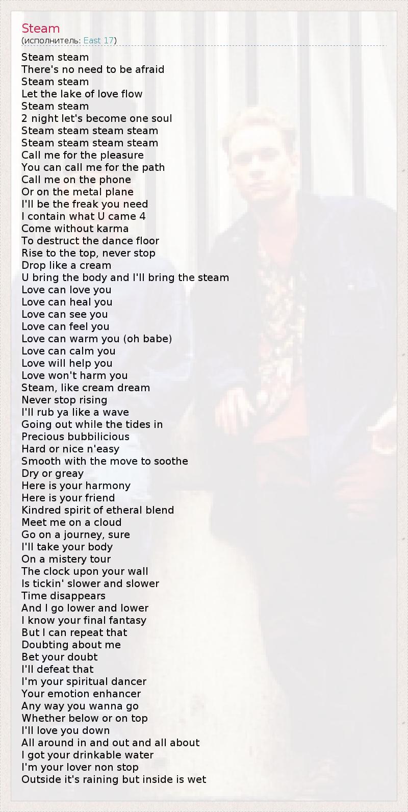 Steam steam There's no need to be afraid Steam steam Let the lake of love flow Steam steam 2 night let's become one soul Steam steam steam steam Steam steam steam steam Call me for the pleasure You can call me for the path Call me on the phone Or on the metal plane I'll be the freak you need I contain what U came 4 Come without karma To destruct the dance floor Rise to the top, never stop Drop like a cream U bring the body and I'll bring the steam Love can love you Love can heal you Love can see you Love can feel you Love can warm you (oh babe) Love can calm you Love will help you Love won't harm you Steam, like cream dream Never stop rising I'll rub ya like a wave Going out while the tides in Precious bubbilicious Hard or nice n'easy Smooth with the move to soothe Dry or greay Here is your harmony Here is your friend Kindred spirit of etheral blend Meet me on a cloud Go on a journey, sure I'll take your body On a mistery tour The clock upon your wall Is tickin' slower and slower Time disappears And I go lower and lower I know your final fantasy But I can repeat that Doubting about me Bet your doubt I'll defeat that I'm your spiritual dancer Your emotion enhancer Any way you wanna go Whether below or on top I'll love you down All around in and out and all about I got your drinkable water I'm your lover non stop Outside it's raining but inside is wet