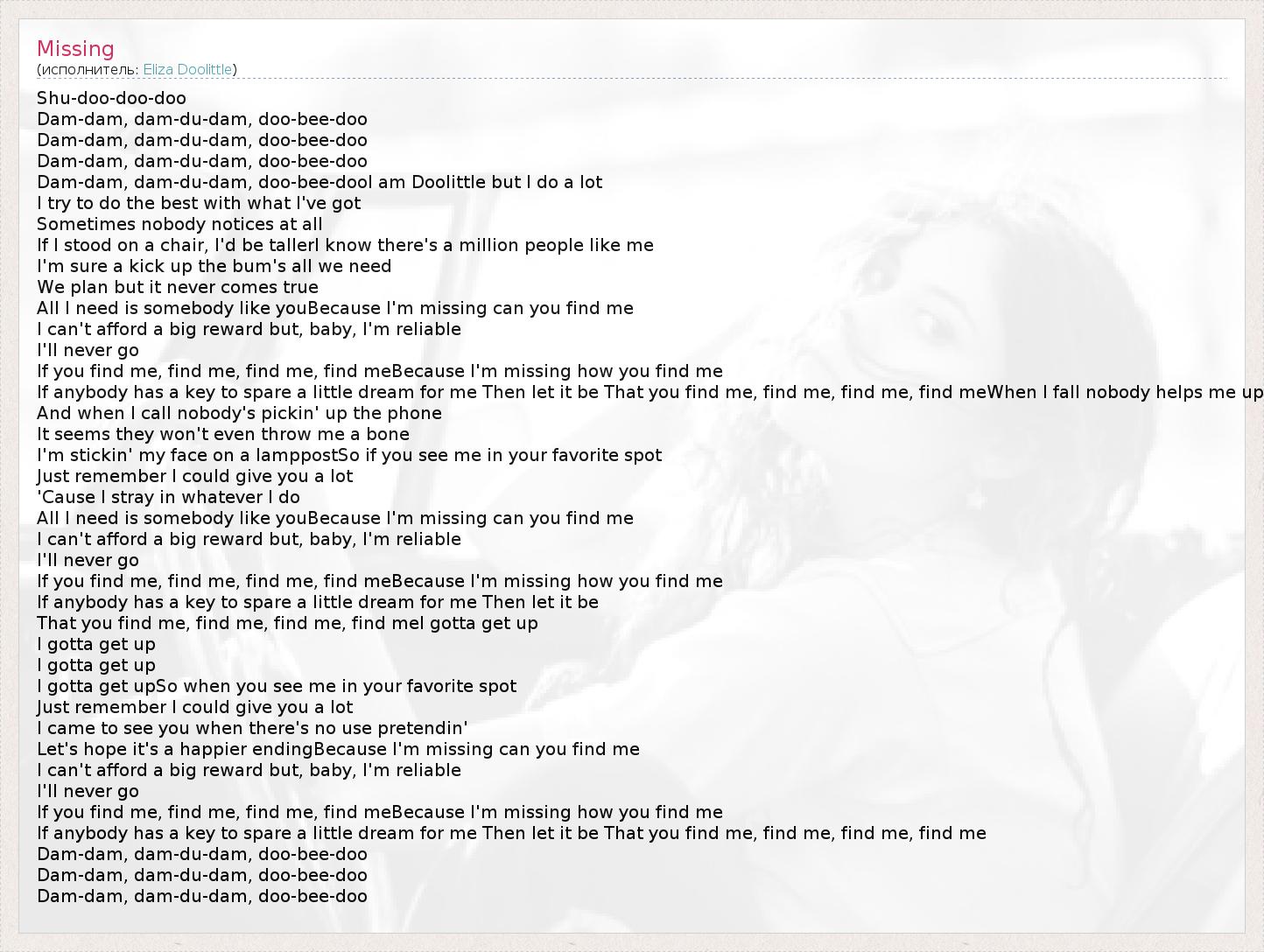 Это интересно:Элиза Дулитл (урожденная Софи Элиза Кэрд, 15 апреля 1988 года), является британской певицей и автором песен из Лондона. Она подписала контракт с лейблом Parlophone. Ее дебютный, одноименный альбом, Элиза Дулитл выпустила 12 июля 2010 года. Ее дебют был на 3-ем месте в британских чартах. После выпуска альбома еще две ее записи попали в топ-25 в чарте, включая ее сингл "Skinny Genes". Второй сингл, "Pack Up",... продолжение