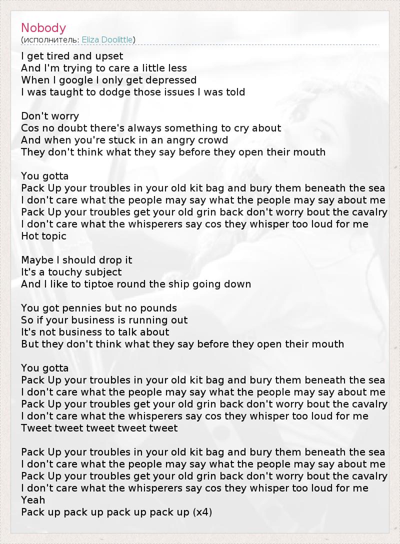 Я утомлена и расстроена, Но стараюсь меньше волноваться. Когда я гуглю, я лишь впадаю в депрессию. Меня учили избегать таких вопросов, мне говорили: Не беспокойся, Ведь несомненно всегда можно найти, над чем поплакать. А когда ты застреваешь в раздражённой толпе, Никто не думает, что сказать, прежде чем открывает рот. Ты должна Упаковать свои беды в старый мешок и похоронить на дне моря. Мне всё равно, что могут сказать люди, что обо мне скажут другие: Упакуй свои беды, начни улыбаться как прежде и не думай о подмоге. Мне всё равно, что скажут сплетники, потому что они шепчутся слишком громко - Горячая тема! Может, мне следует прекратить это, Ведь это щекотливая тема, А я люблю ходить в ожидании вокруг тонущего корабля... У тебя есть пенсы, а не фунты, Поэтому если твой бизнес разваливается, Не по-деловому об этом вести разговоры. Но никто не думает, что сказать, прежде чем открывает рот... Ты должна Упаковать свои беды в старый мешок и похоронить на дне моря. Мне всё равно, что могут сказать люди, что обо мне скажут другие: Упакуй свои беды, начни улыбаться как прежде и не думай о подмоге. Мне всё равно, что скажут сплетники, потому что они шепчутся слишком громко - Чик-чирик чик-чирик чик-чирик! Упакуй свои беды в старый мешок и похорони на дне моря. Мне всё равно, что могут сказать люди, что обо мне скажут другие: Упакуй свои беды, начни улыбаться как прежде и не думай о подмоге. Мне всё равно, что скажут сплетники, потому что они шепчутся слишком громко - Да, Упакуй, упакуй, упакуй, упакуй (4 раза)