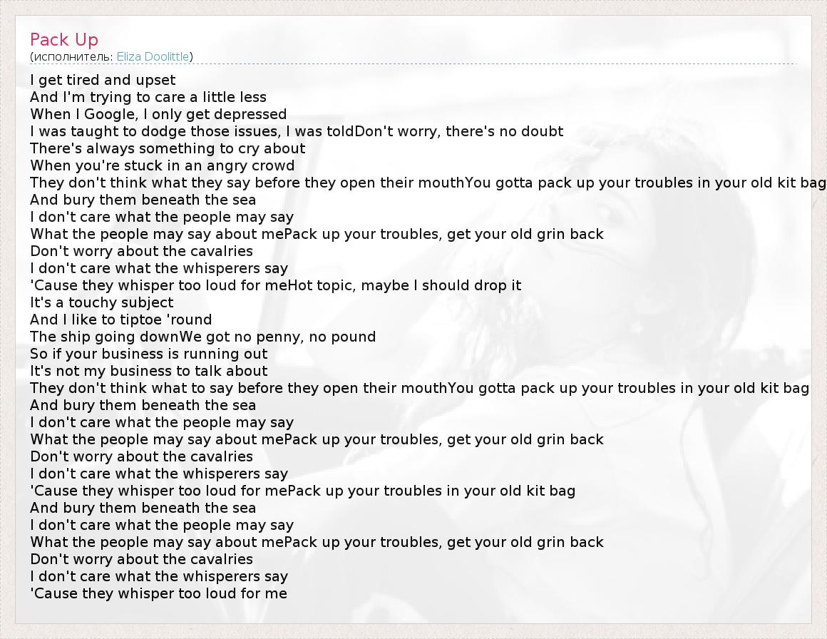 I get tired and upset And I'm trying to care a little less When I Google, I only get depressed I was taught to dodge those issues, I was toldDon't worry, there's no doubt There's always something to cry about When you're stuck in an angry crowd They don't think what they say before they open their mouthYou gotta pack up your troubles in your old kit bag And bury them beneath the sea I don't care what the people may say What the people may say about mePack up your troubles, get your old grin back Don't worry about the cavalries I don't care what the whisperers say 'Cause they whisper too loud for meHot topic, maybe I should drop it It's a touchy subject And I like to tiptoe 'round The ship going downWe got no penny, no pound So if your business is running out It's not my business to talk about They don't think what to say before they open their mouthYou gotta pack up your troubles in your old kit bag And bury them beneath the sea I don't care what the people may say What the people may say about mePack up your troubles, get your old grin back Don't worry about the cavalries I don't care what the whisperers say 'Cause they whisper too loud for mePack up your troubles in your old kit bag And bury them beneath the sea I don't care what the people may say What the people may say about mePack up your troubles, get your old grin back Don't worry about the cavalries I don't care what the whisperers say 'Cause they whisper too loud for me