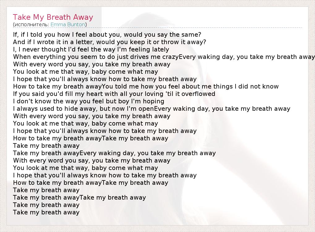 If, if I told you how I feel about you, would you say the same? And if I wrote it in a letter, would you keep it or throw it away? I, I never thought I'd feel the way I'm feeling lately When everything you seem to do just drives me crazyEvery waking day, you take my breath away With every word you say, you take my breath away You look at me that way, baby come what may I hope that you'll always know how to take my breath away How to take my breath awayYou told me how you feel about me things I did not know If you said you'd fill my heart with all your loving 'til it overflowed I don't know the way you feel but boy I'm hoping I always used to hide away, but now I'm openEvery waking day, you take my breath away With every word you say, you take my breath away You look at me that way, baby come what may I hope that you'll always know how to take my breath away How to take my breath awayTake my breath away Take my breath away Take my breath awayEvery waking day, you take my breath away With every word you say, you take my breath away You look at me that way, baby come what may I hope that you'll always know how to take my breath away How to take my breath awayTake my breath away Take my breath away Take my breath awayTake my breath away Take my breath away Take my breath away