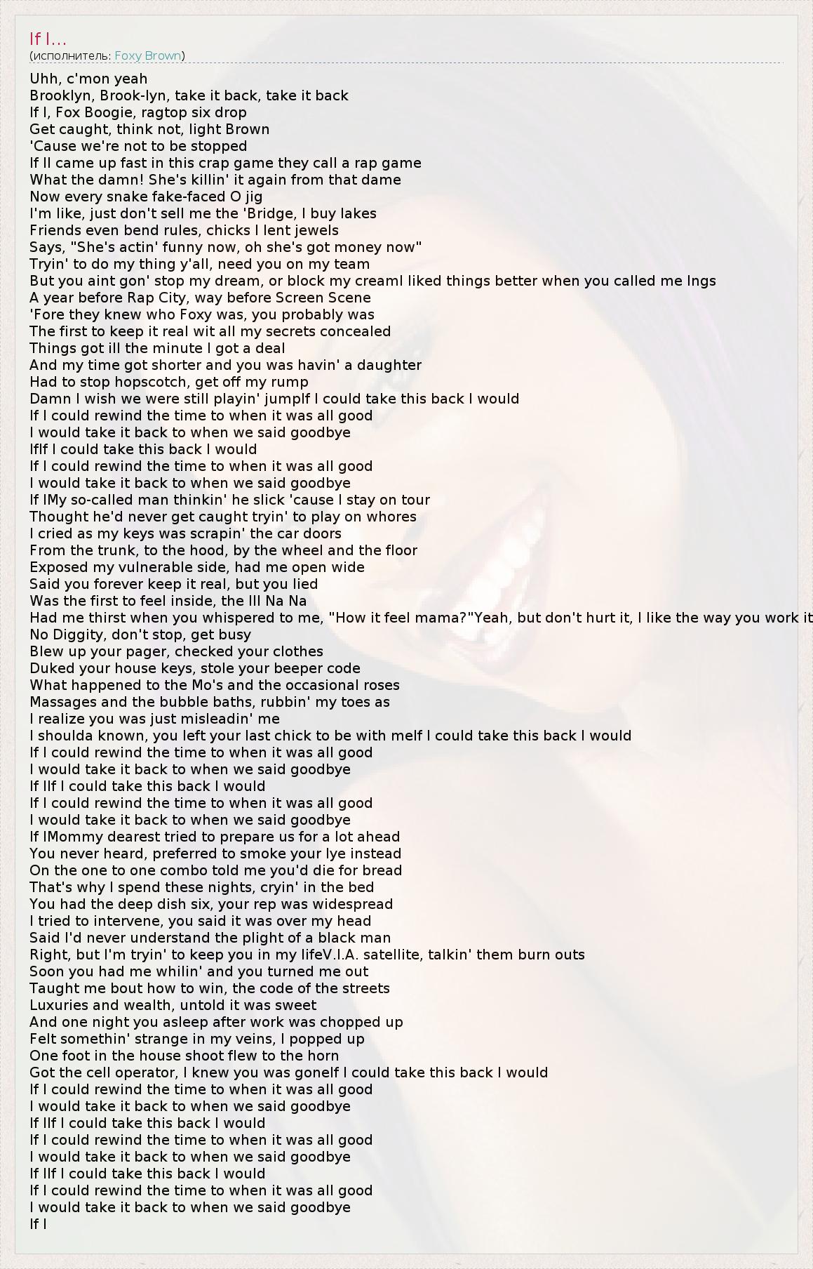Это интересно:Foxy Brown — это не грациозная старушка Queen Latifah и даже не заводная тетка MC Lyte. Таким, как она, пронырливым особам палец в рот не суй. Новому поколению женского рэпа уже недостаточно, чтобы их уважали и считали реальными, несмотря на их пол; наоборот, они находят в женских слабостях свою выгоду и используют природную сексуальность в борьбе за слушателя, который, очевидно, скоро окончательно трансформируется... продолжение