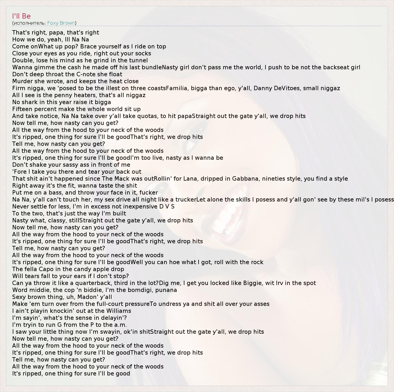 Это интересно:Foxy Brown — это не грациозная старушка Queen Latifah и даже не заводная тетка MC Lyte. Таким, как она, пронырливым особам палец в рот не суй. Новому поколению женского рэпа уже недостаточно, чтобы их уважали и считали реальными, несмотря на их пол; наоборот, они находят в женских слабостях свою выгоду и используют природную сексуальность в борьбе за слушателя, который, очевидно, скоро окончательно трансформируется... продолжение