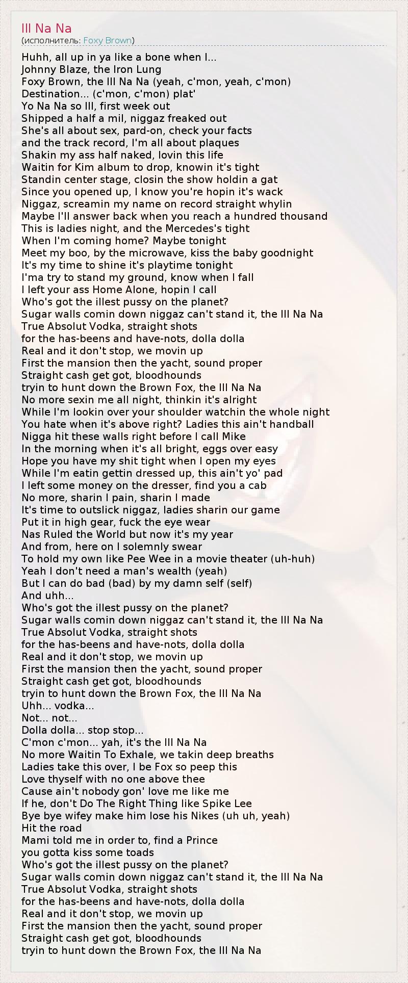 Huhh, all up in ya like a bone when I... Johnny Blaze, the Iron Lung Foxy Brown, the Ill Na Na (yeah, c'mon, yeah, c'mon) Destination... (c'mon, c'mon) plat' Yo Na Na so Ill, first week out Shipped a half a mil, niggaz freaked out She's all about sex, pard-on, check your facts and the track record, I'm all about plaques Shakin my ass half naked, lovin this life Waitin for Kim album to drop, knowin it's tight Standin center stage, closin the show holdin a gat Since you opened up, I know you're hopin it's wack Niggaz, screamin my name on record straight whylin Maybe I'll answer back when you reach a hundred thousand This is ladies night, and the Mercedes's tight When I'm coming home? Maybe tonight Meet my boo, by the microwave, kiss the baby goodnight It's my time to shine it's playtime tonight I'ma try to stand my ground, know when I fall I left your ass Home Alone, hopin I call Who's got the illest pussy on the planet? Sugar walls comin down niggaz can't stand it, the Ill Na Na True Absolut Vodka, straight shots for the has-beens and have-nots, dolla dolla Real and it don't stop, we movin up First the mansion then the yacht, sound proper Straight cash get got, bloodhounds tryin to hunt down the Brown Fox, the Ill Na Na No more sexin me all night, thinkin it's alright While I'm lookin over your shoulder watchin the whole night You hate when it's above right? Ladies this ain't handball Nigga hit these walls right before I call Mike In the morning when it's all bright, eggs over easy Hope you have my shit tight when I open my eyes While I'm eatin gettin dressed up, this ain't yo' pad I left some money on the dresser, find you a cab No more, sharin I pain, sharin I made It's time to outslick niggaz, ladies sharin our game Put it in high gear, fuck the eye wear Nas Ruled the World but now it's my year And from, here on I solemnly swear To hold my own like Pee Wee in a movie theater (uh-huh) Yeah I don't need a man's wealth (yeah) But I can do bad (bad) by my damn self (self) And uhh... Who's got the illest pussy on the planet? Sugar walls comin down niggaz can't stand it, the Ill Na Na True Absolut Vodka, straight shots for the has-beens and have-nots, dolla dolla Real and it don't stop, we movin up First the mansion then the yacht, sound proper Straight cash get got, bloodhounds tryin to hunt down the Brown Fox, the Ill Na Na Uhh... vodka... Not... not... Dolla dolla... stop stop... C'mon c'mon... yah, it's the Ill Na Na No more Waitin To Exhale, we takin deep breaths Ladies take this over, I be Fox so peep this Love thyself with no one above thee Cause ain't nobody gon' love me like me If he, don't Do The Right Thing like Spike Lee Bye bye wifey make him lose his Nikes (uh uh, yeah) Hit the road Mami told me in order to, find a Prince you gotta kiss some toads Who's got the illest pussy on the planet? Sugar walls comin down niggaz can't stand it, the Ill Na Na True Absolut Vodka, straight shots for the has-beens and have-nots, dolla dolla Real and it don't stop, we movin up First the mansion then the yacht, sound proper Straight cash get got, bloodhounds tryin to hunt down the Brown Fox, the Ill Na Na