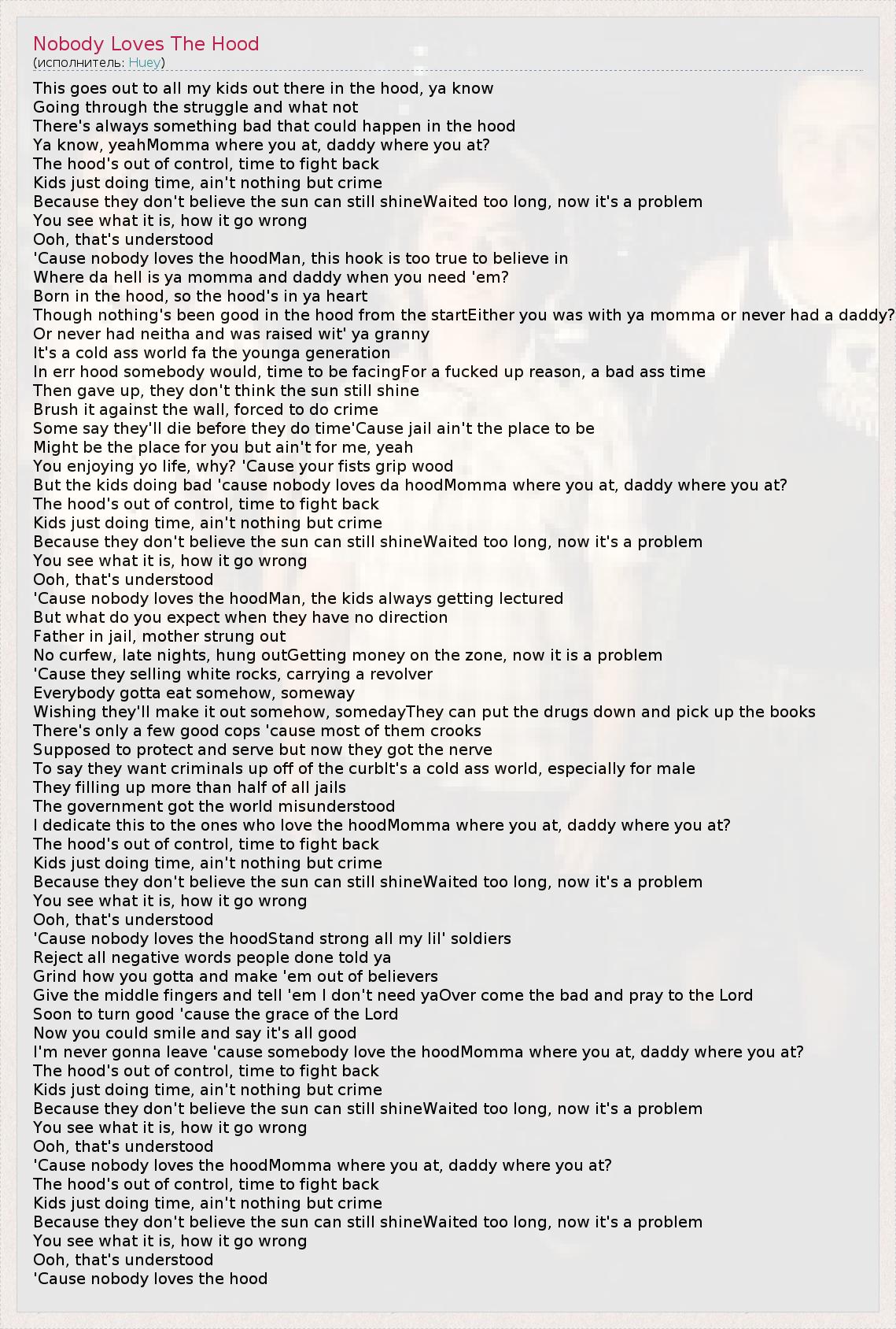А как ты думаешь, о чем песня "Nobody Loves The Hood" ?