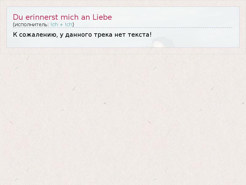 Это интересно:Ich + Ich (нем. "Я + Я") — немецкая поп-группа, основаная Аннеттой Хумпе и Аделем Тавилем. Они познакомились весной 2002 случайно в студии звукозаписи в Берлине. 18 апреля 2005 вышел их первый сингл «Geht’s dir schon besser?». Песни «Du erinnerst mich an Liebe» и «Dienen» попали в лучшую десятку Германии.
