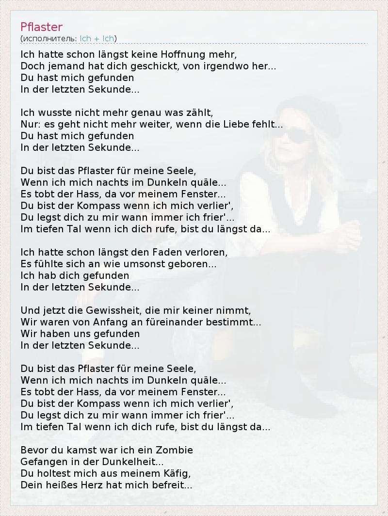 Это интересно:Ich + Ich (нем. "Я + Я") — немецкая поп-группа, основаная Аннеттой Хумпе и Аделем Тавилем. Они познакомились весной 2002 случайно в студии звукозаписи в Берлине. 18 апреля 2005 вышел их первый сингл «Geht’s dir schon besser?». Песни «Du erinnerst mich an Liebe» и «Dienen» попали в лучшую десятку Германии.