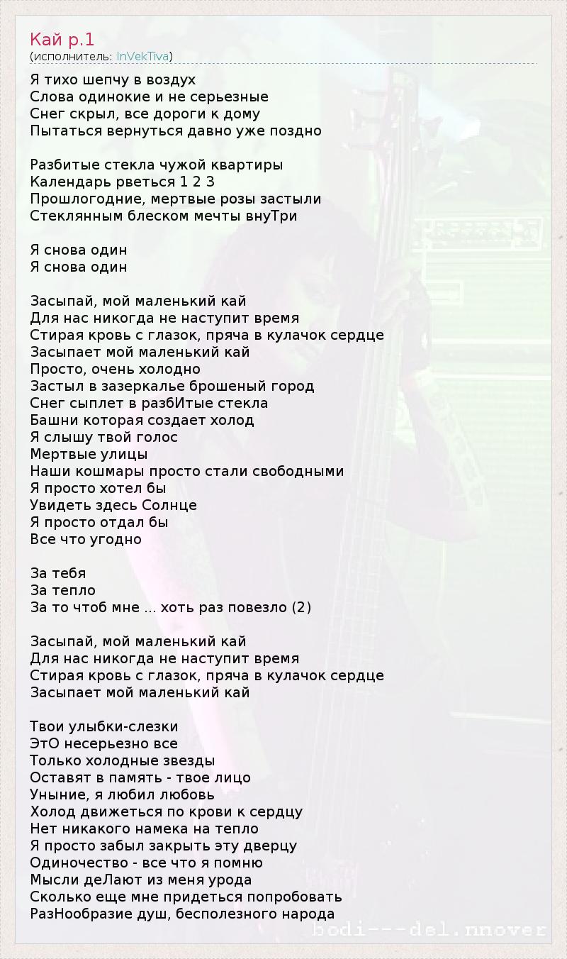 Я тихо шепчу в воздух Слова одинокие и не серьезные Снег скрыл, все дороги к дому Пытаться вернуться давно уже поздно Разбитые стекла чужой квартиры Календарь рветься 1 2 3 Прошлогодние, мертвые розы застыли Стеклянным блеском мечты внуТри Я снова один Я снова один Засыпай, мой маленький кай Для нас никогда не наступит время Стирая кровь с глазок, пряча в кулачок сердце Засыпает мой маленький кай Просто, очень холодно Застыл в зазеркалье брошеный город Снег сыплет в разбИтые стекла Башни которая создает холод Я слышу твой голос Мертвые улицы Наши кошмары просто стали свободными Я просто хотел бы Увидеть здесь Солнце Я просто отдал бы Все что угодно За тебя За тепло За то чтоб мне ... хоть раз повезло (2) Засыпай, мой маленький кай Для нас никогда не наступит время Стирая кровь с глазок, пряча в кулачок сердце Засыпает мой маленький кай Твои улыбки-слезки ЭтО несерьезно все Только холодные звезды Оставят в память - твое лицо Уныние, я любил любовь Холод движеться по крови к сердцу Нет никакого намека на тепло Я просто забыл закрыть эту дверцу Одиночество - все что я помню Мысли деЛают из меня урода Сколько еще мне придеться попробовать РазНообразие душ, бесполезного народа