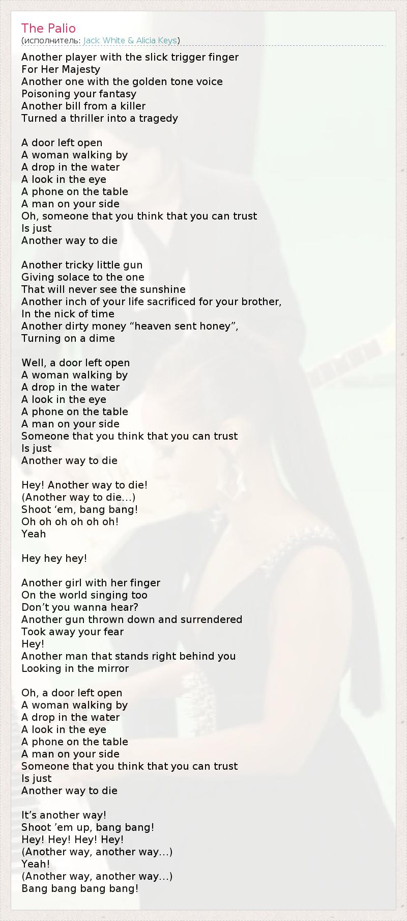 Another player with the slick trigger finger For Her Majesty Another one with the golden tone voice Poisoning your fantasy Another bill from a killer Turned a thriller into a tragedy A door left open A woman walking by A drop in the water A look in the eye A phone on the table A man on your side Oh, someone that you think that you can trust Is just Another way to die Another tricky little gun Giving solace to the one That will never see the sunshine Another inch of your life sacrificed for your brother, In the nick of time Another dirty money “heaven sent honey”, Turning on a dime Well, a door left open A woman walking by A drop in the water A look in the eye A phone on the table A man on your side Someone that you think that you can trust Is just Another way to die Hey! Another way to die! (Another way to die…) Shoot ‘em, bang bang! Oh oh oh oh oh oh! Yeah Hey hey hey! Another girl with her finger On the world singing too Don’t you wanna hear? Another gun thrown down and surrendered Took away your fear Hey! Another man that stands right behind you Looking in the mirror Oh, a door left open A woman walking by A drop in the water A look in the eye A phone on the table A man on your side Someone that you think that you can trust Is just Another way to die It’s another way! Shoot ’em up, bang bang! Hey! Hey! Hey! Hey! (Another way, another way…) Yeah! (Another way, another way…) Bang bang bang bang!