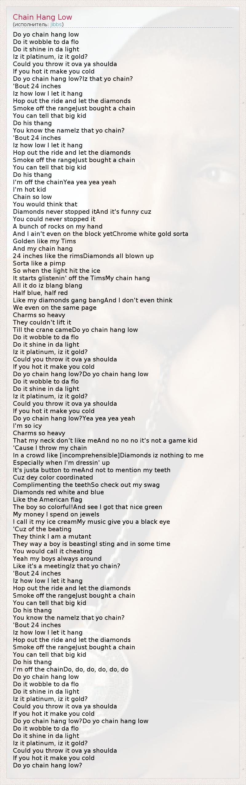 Do yo chain hang low Do it wobble to da flo Do it shine in da light Iz it platinum, iz it gold? Could you throw it ova ya shoulda If you hot it make you cold Do yo chain hang low?Iz that yo chain? 'Bout 24 inches Iz how low I let it hang Hop out the ride and let the diamonds Smoke off the rangeJust bought a chain You can tell that big kid Do his thang You know the nameIz that yo chain? 'Bout 24 inches Iz how low I let it hang Hop out the ride and let the diamonds Smoke off the rangeJust bought a chain You can tell that big kid Do his thang I'm off the chainYea yea yea yeah I'm hot kid Chain so low You would think that Diamonds never stopped itAnd it's funny cuz You could never stopped it A bunch of rocks on my hand And I ain't even on the block yetChrome white gold sorta Golden like my Tims And my chain hang 24 inches like the rimsDiamonds all blown up Sorta like a pimp So when the light hit the ice It starts glistenin' off the TimsMy chain hang All it do iz blang blang Half blue, half red Like my diamonds gang bangAnd I don't even think We even on the same page Charms so heavy They couldn't lift it Till the crane cameDo yo chain hang low Do it wobble to da flo Do it shine in da light Iz it platinum, iz it gold? Could you throw it ova ya shoulda If you hot it make you cold Do yo chain hang low?Do yo chain hang low Do it wobble to da flo Do it shine in da light Iz it platinum, iz it gold? Could you throw it ova ya shoulda If you hot it make you cold Do yo chain hang low?Yea yea yea yeah I'm so icy Charms so heavy That my neck don't like meAnd no no no it's not a game kid 'Cause I throw my chain In a crowd like [incomprehensible]Diamonds iz nothing to me Especially when I'm dressin' up It's justa button to meAnd not to mention my teeth Cuz dey color coordinated Complimenting the teethSo check out my swag Diamonds red white and blue Like the American flag The boy so colorful!And see I got that nice green My money I spend on jewels I call it my ice creamMy music give you a black eye 'Cuz of the beating They think I am a mutant They way a boy is beastingI sting and in some time You would call it cheating Yeah my boys always around Like it's a meetingIz that yo chain? 'Bout 24 inches Iz how low I let it hang Hop out the ride and let the diamonds Smoke off the rangeJust bought a chain You can tell that big kid Do his thang You know the nameIz that yo chain? 'Bout 24 inches Iz how low I let it hang Hop out the ride and let the diamonds Smoke off the rangeJust bought a chain You can tell that big kid Do his thang I'm off the chainDo, do, do, do, do, do Do yo chain hang low Do it wobble to da flo Do it shine in da light Iz it platinum, iz it gold? Could you throw it ova ya shoulda If you hot it make you cold Do yo chain hang low?Do yo chain hang low Do it wobble to da flo Do it shine in da light Iz it platinum, iz it gold? Could you throw it ova ya shoulda If you hot it make you cold Do yo chain hang low?